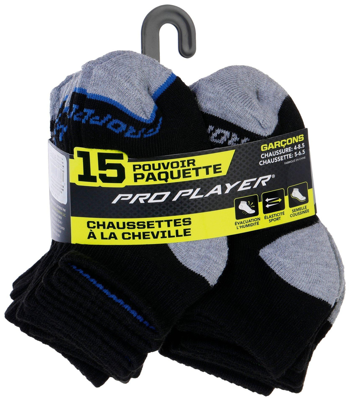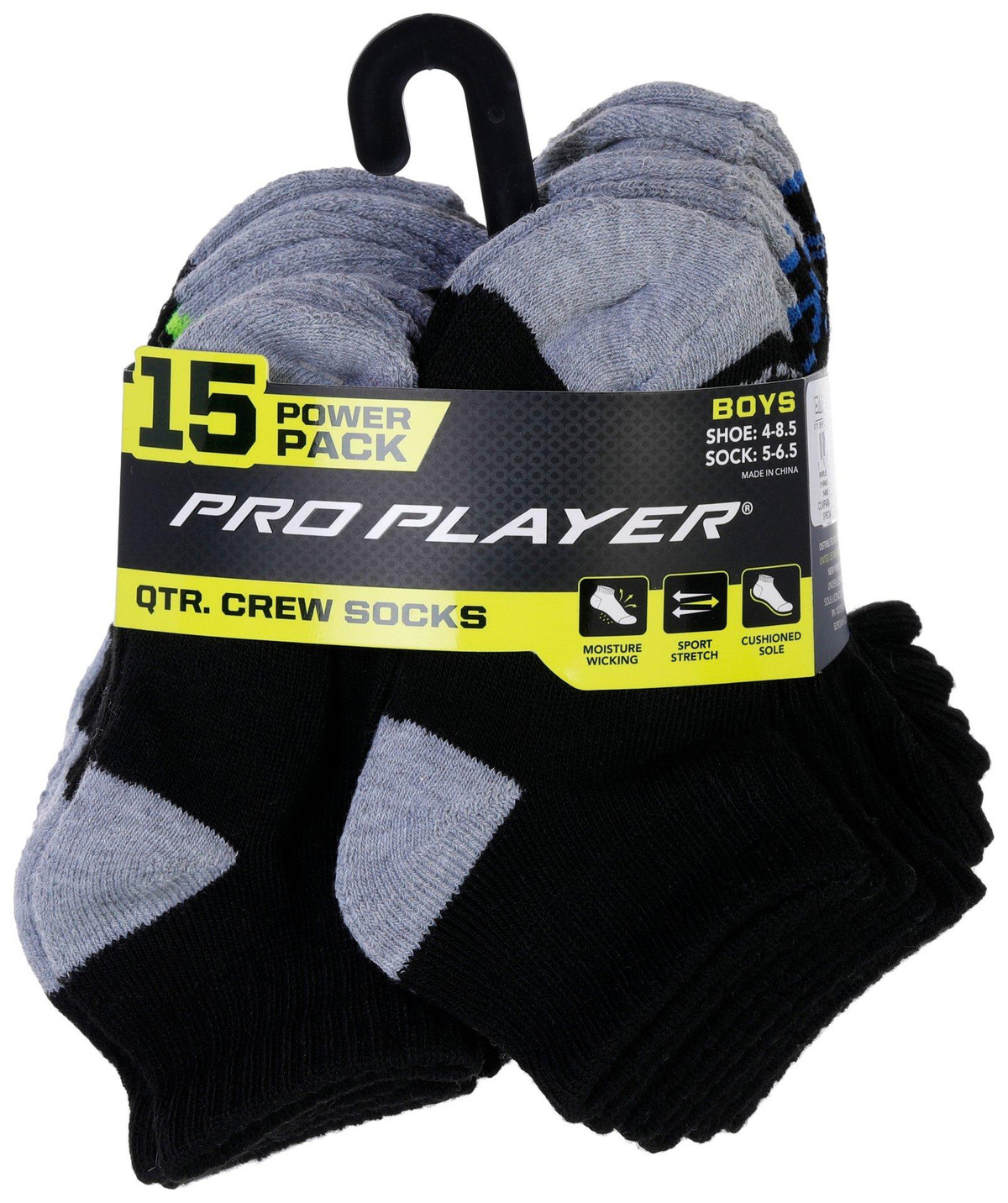 Keep your childs feet comfortable and supported with this 15-pack of Boys Quarter Crew Socks. Designed with a cushioned sole, they offer all-day comfort for active play. Moisture-wicking fabric and sport stretch ensure a secure fit and dry feel, making them perfect for school, sports or everyday wear. Fits boys shoe sizes 4 to 8.5, socks sizes 5 to 6.5. Fabrication is 96% polyester, 2% spandex, 2% rubber.