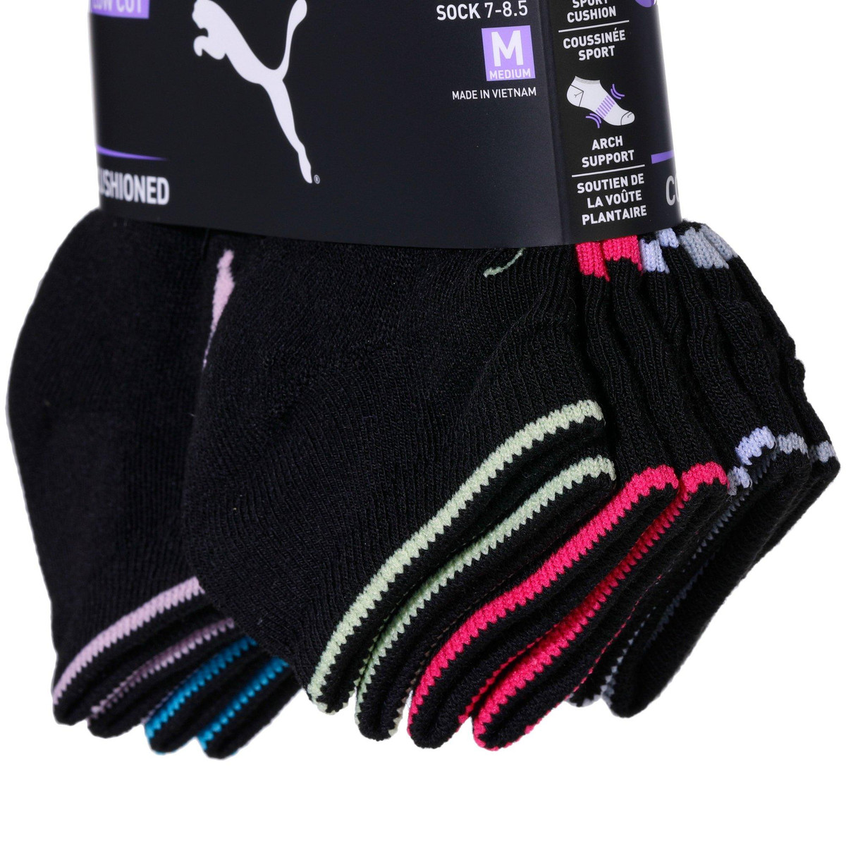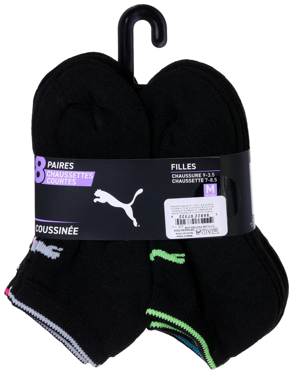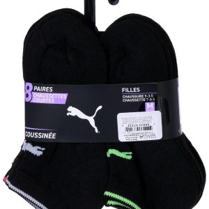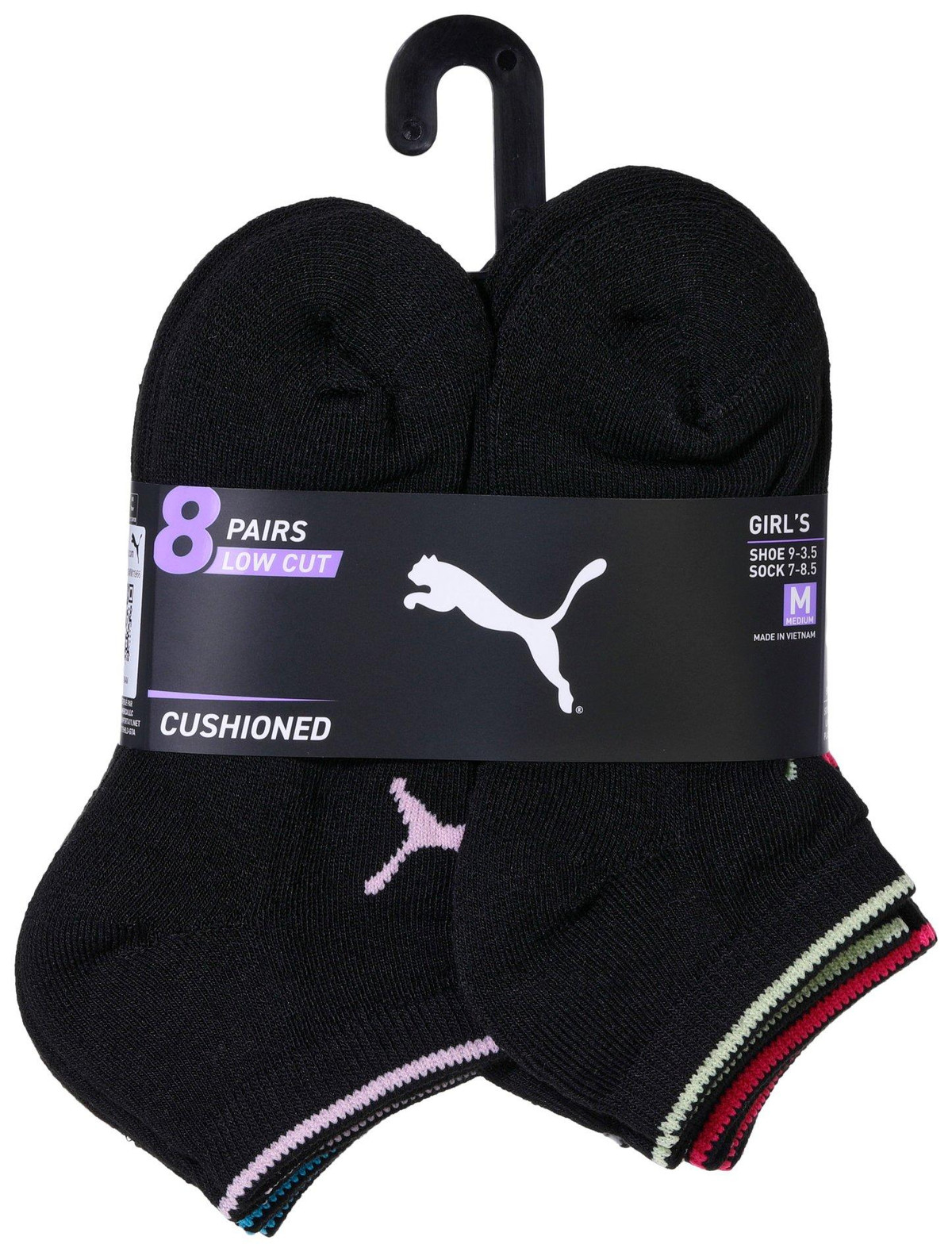 This set includes eight pairs of low cut black cushioned socks designed for girls seeking comfort and support. Featuring arch support for a secure fit and colorful trim for a fun touch these socks are perfect for everyday wear. Made for shoe sizes 9 to 3.5 and sock sizes 7 to 8.5 medium they provide a snug yet breathable feel. Whether for school sports or casual outings these socks offer durability and style in every step.