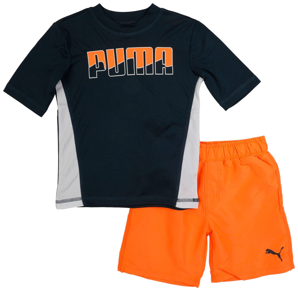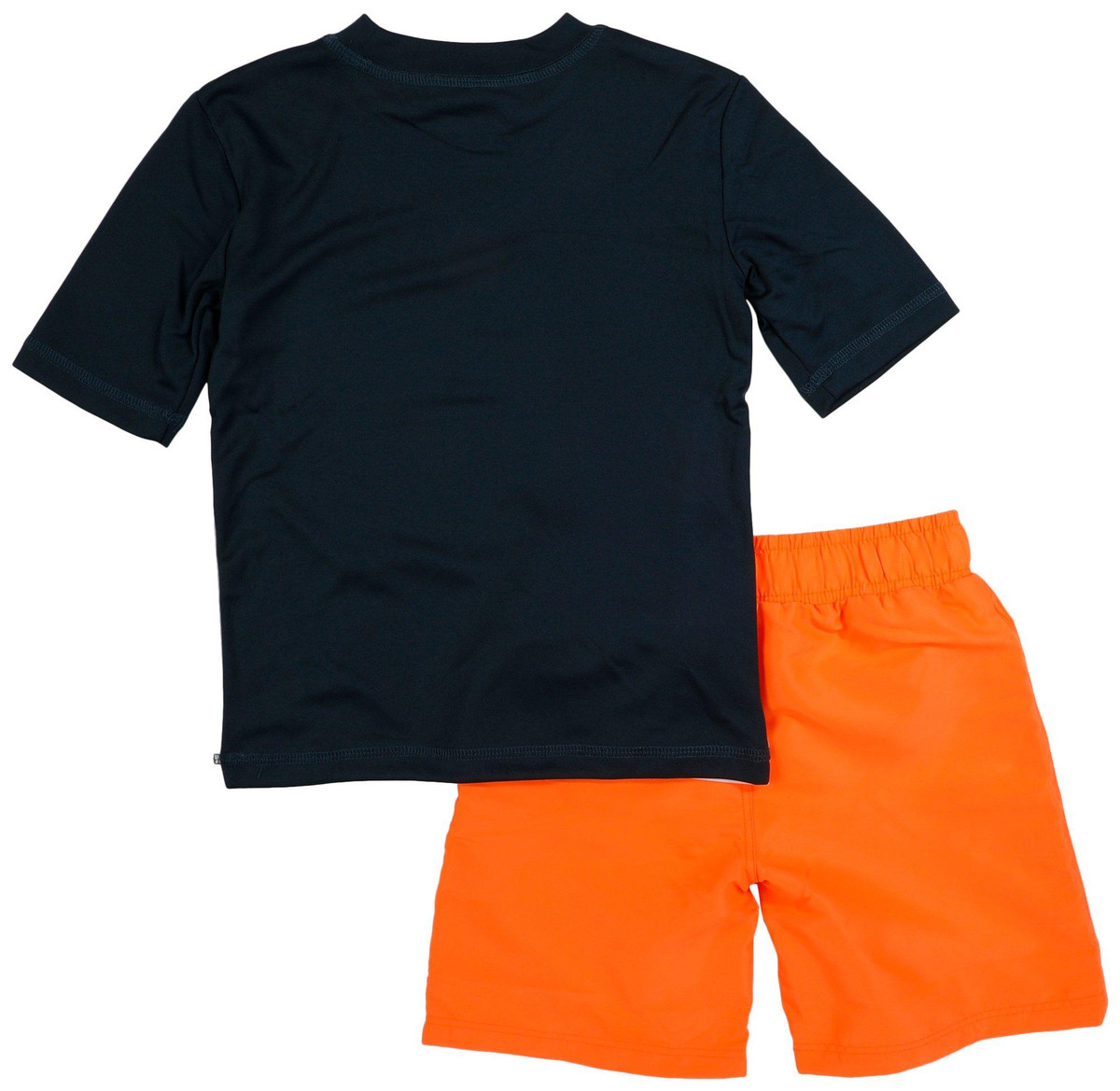 Make a splash in style! This 2-Piece Rashguard & Swim Trunks Set for little boys combines bold logo details with UPF protection for fun in the sun and all-day comfort.