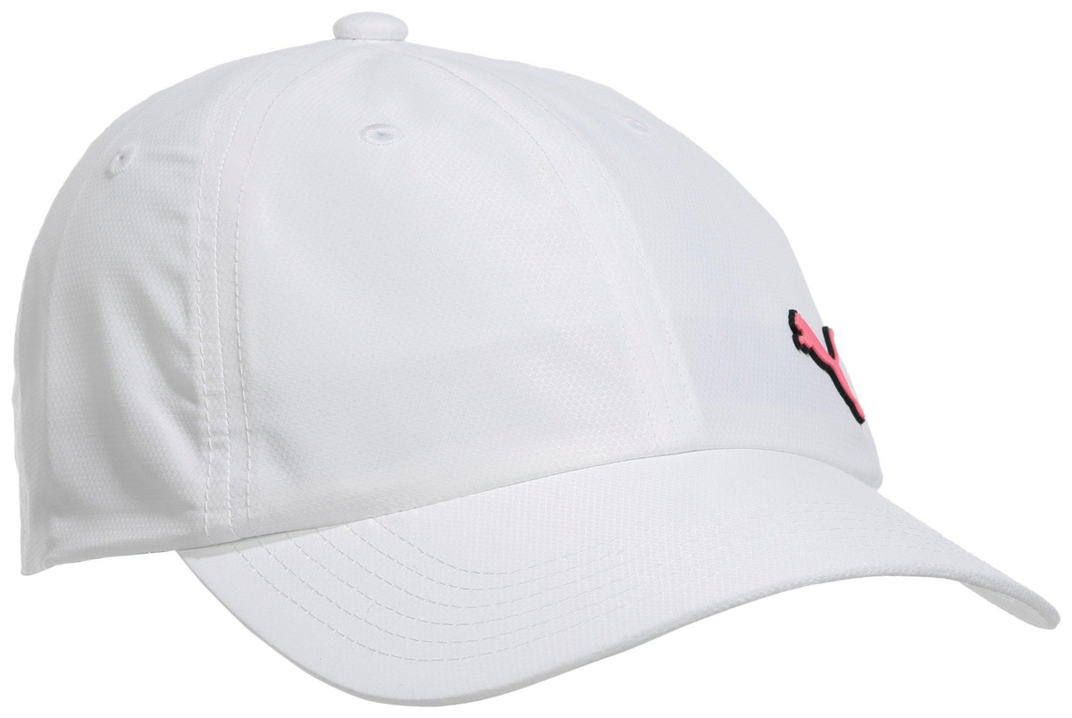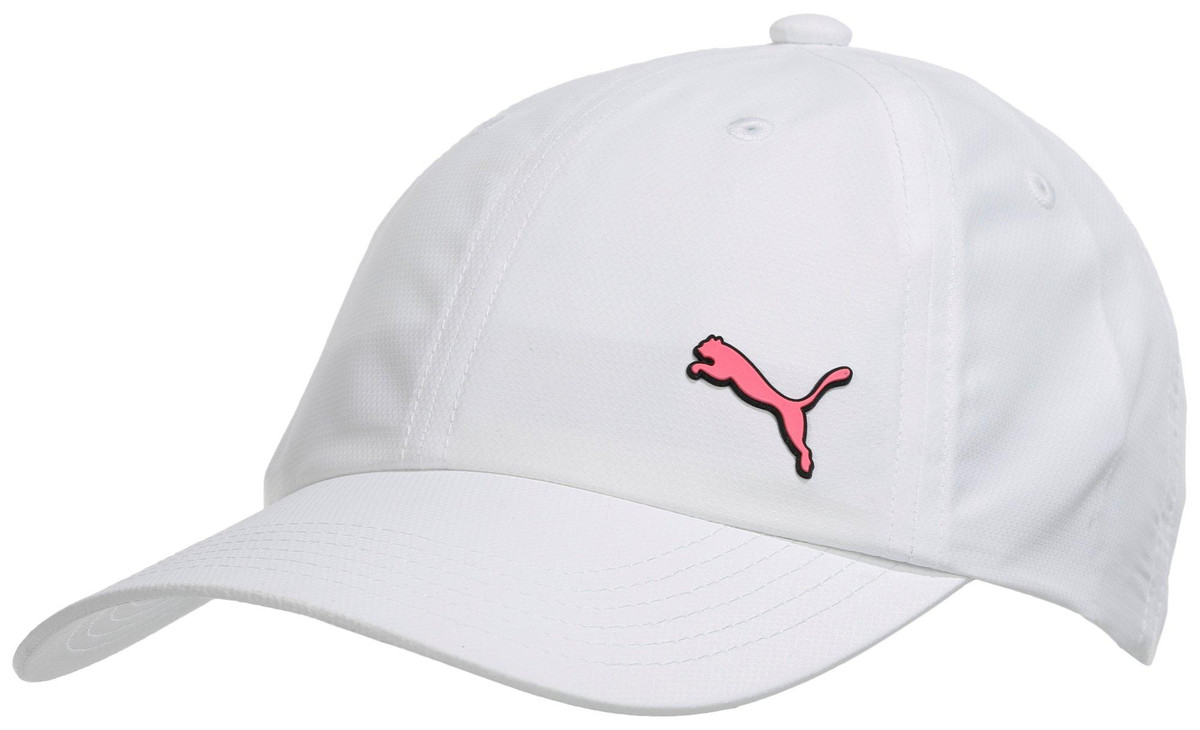 Sport a clean, classic look with this white Puma baseball cap, featuring a vibrant pink Puma logo and curved brim. Lightweight and adjustable for comfort, perfect for workouts, casual wear, and sunny days.