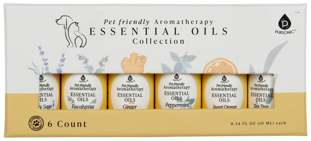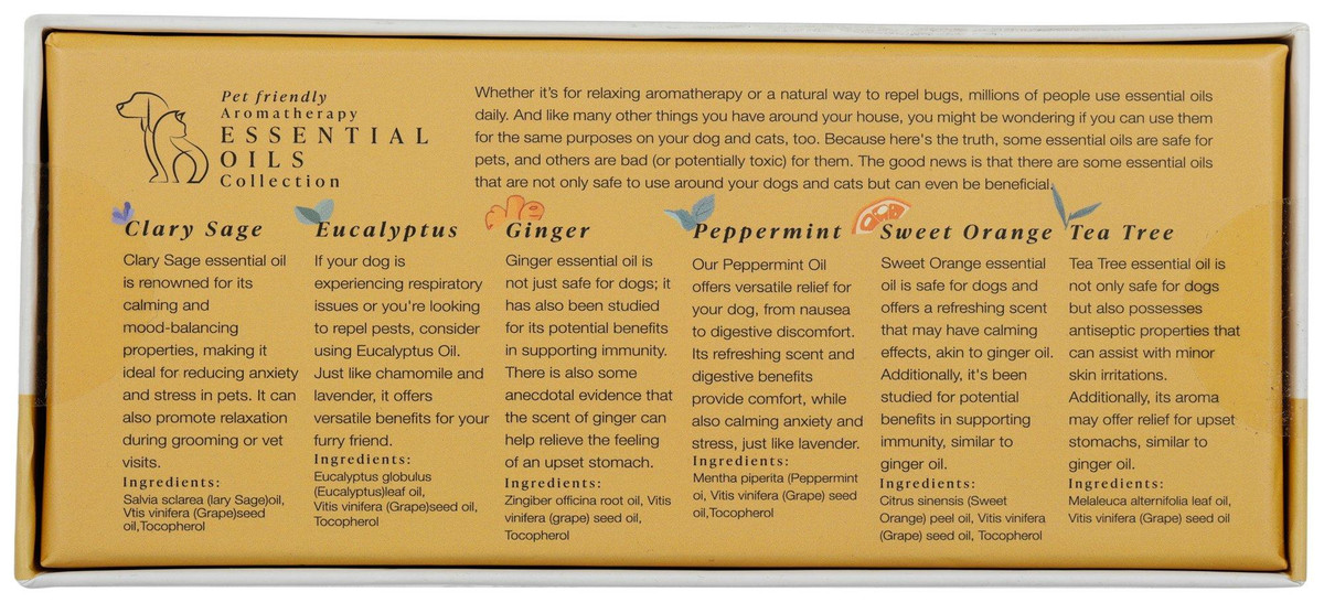 Refresh your space naturally with the 6 Pc Pet Friendly Aromatherapy Essential Oils Set. Includes Clary Sage, Eucalyptus, Ginger, Peppermint, Sweet Orange, and Tea Tree oils, all are safe for use around pets. Ideal for diffusers and daily aromatherapy without compromising pet safety. Each holds .34 fl oz.
