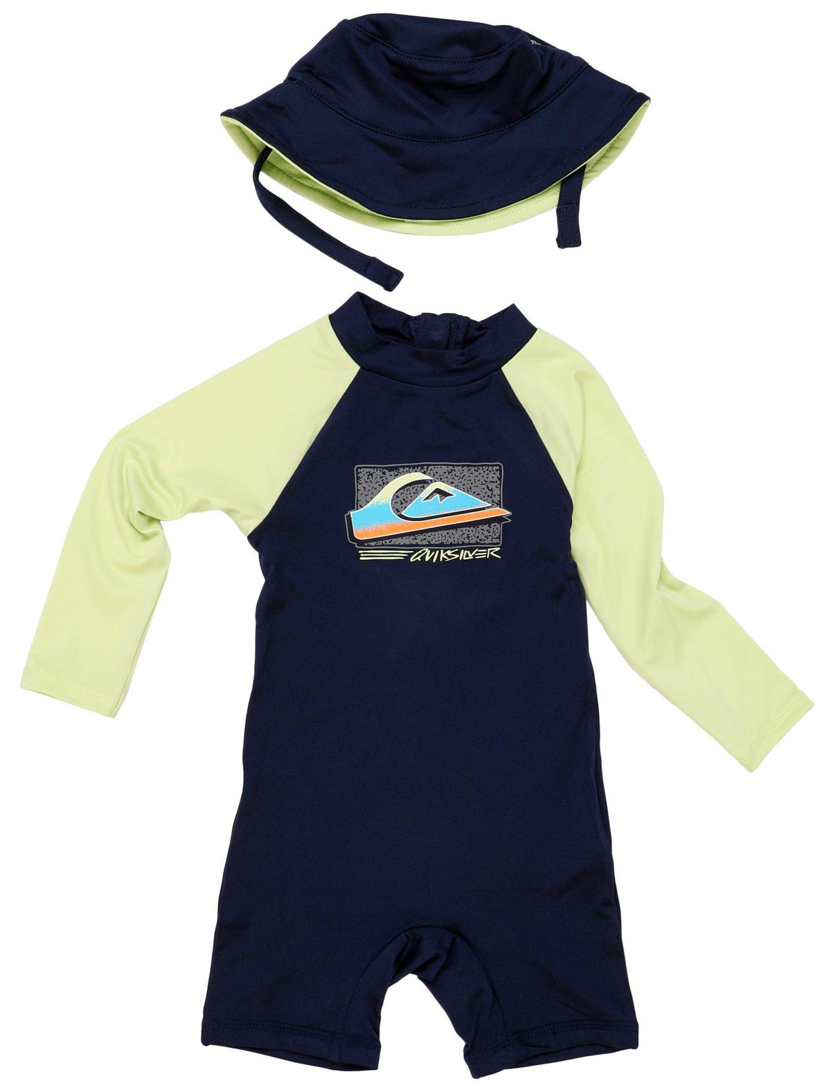 Gear up your little one for sunny adventures with this Baby Boys 2-Piece Rashguard and Hat Set. The long-sleeve rashguard offers UPF 50 sun protection and features a stylish chest logo for a sporty look. Paired with a matching bucket hat complete with a secure Velcro chin strap, this set keeps your baby protected and comfortable all day. Fabrication is 88% polyester, 12% spandex. Length measures approximately 17 in.