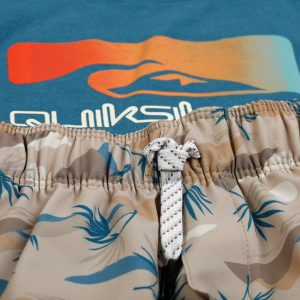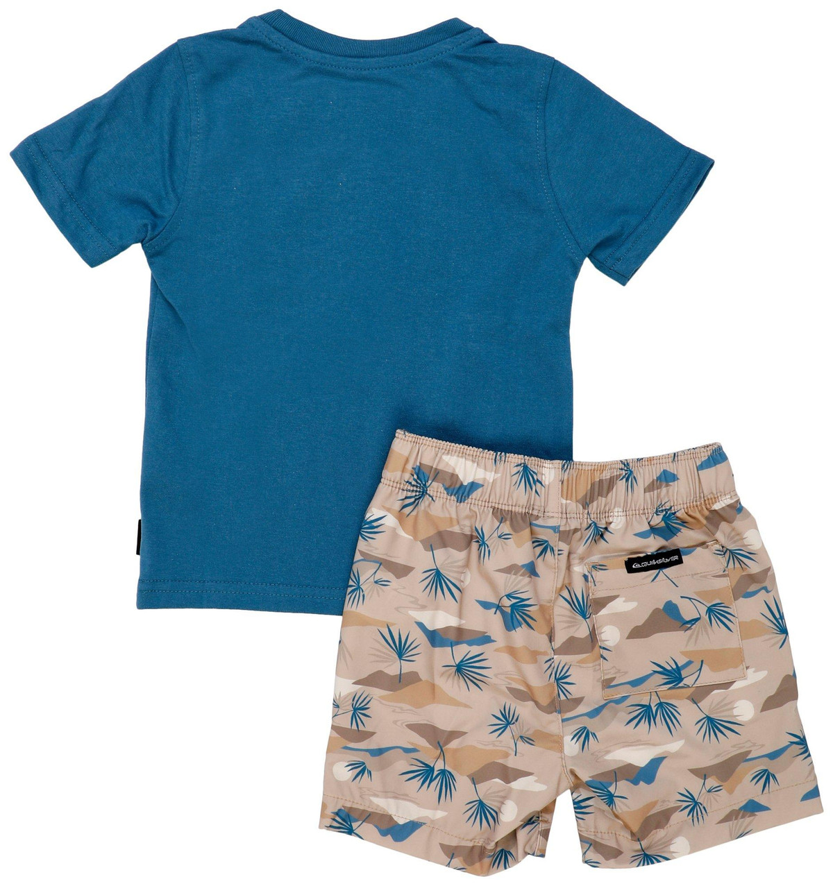 Elevate your casual look with this 2 pc short set, designed for comfort and style. This set includes a graphic logo tee that adds a playful touch to any outfit. Paired with elastic waist shorts featuring a tropical fabric design and double side slip pockets. This set ensures practicality and ease for active days. Fabrication is: Shirt 60% cotton, 40% polyester, Shorts 92% polyester, 8% spandex.