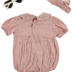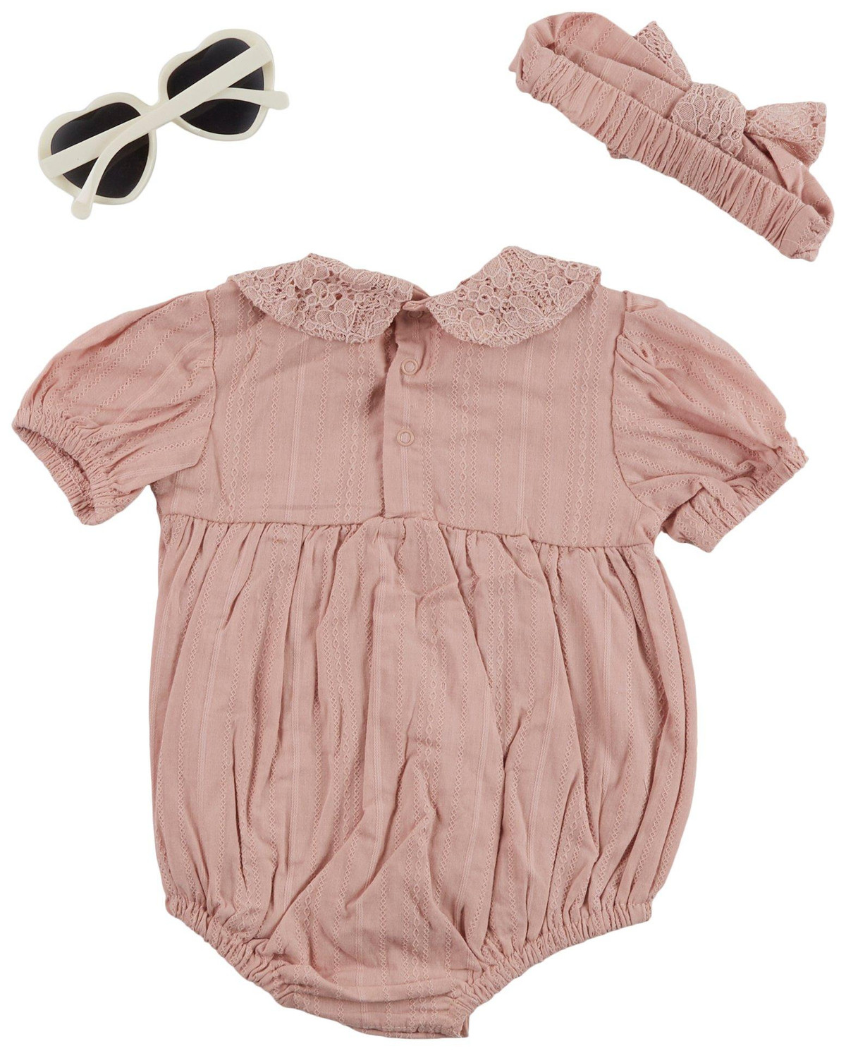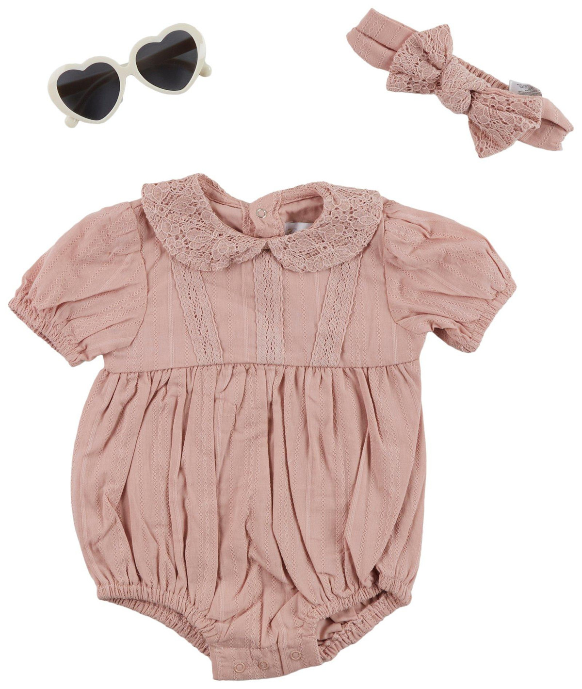 Dress her in sweet style with this Baby Girls 3 Pc Romper Headband Sunglasses Set. Featuring a pink romper with delicate eyelets, the set includes a matching headband and heart-shaped sunglasses with UV protection for added charm and sun safety. Ideal for warm weather outings, photo days or special occasions. Machine wash cold for easy care.