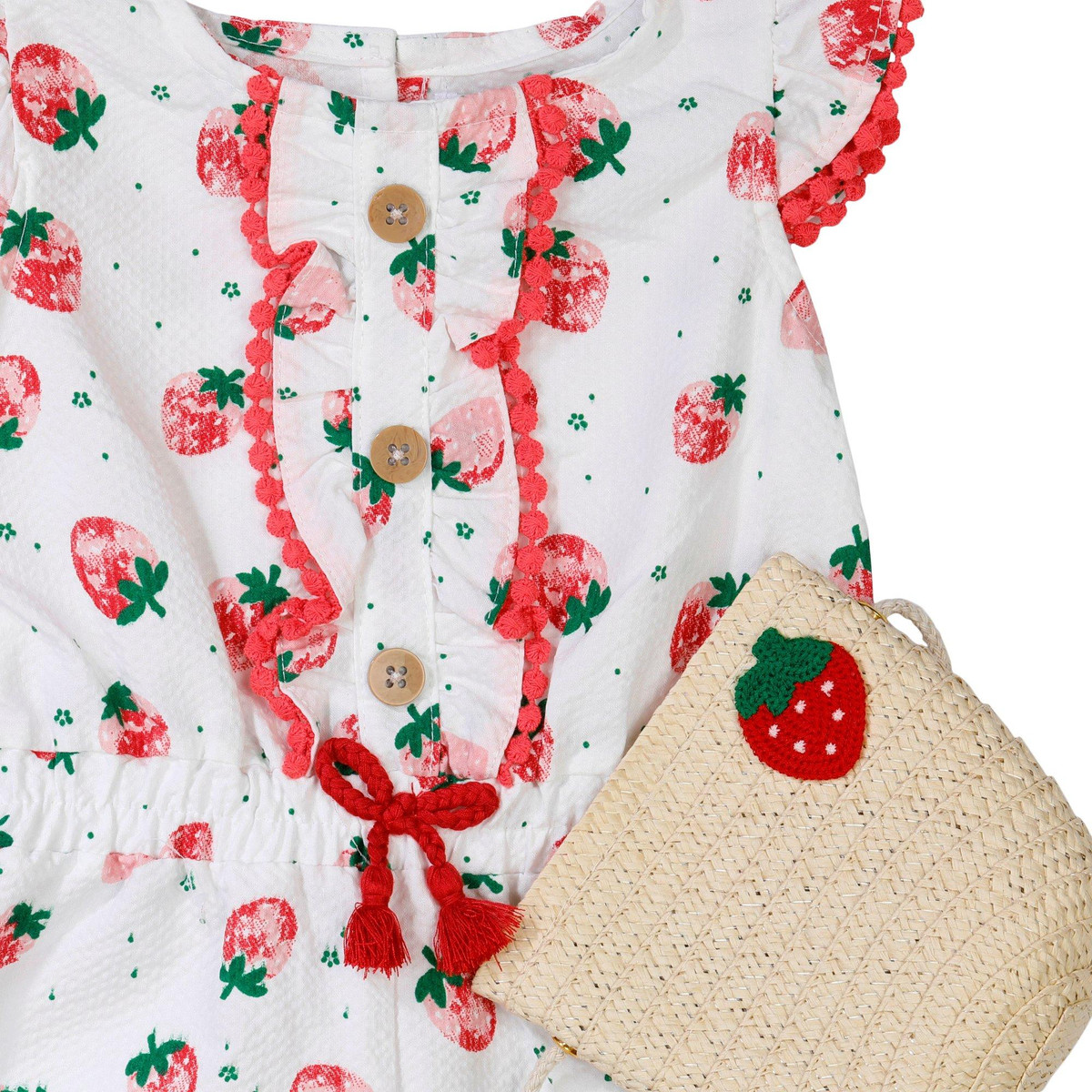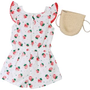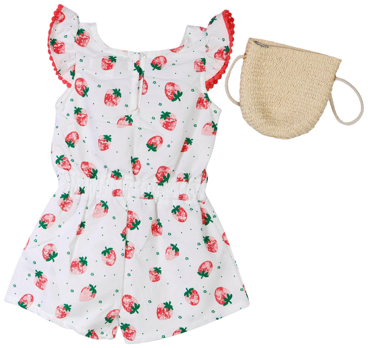 Bring sweet summer charm to her wardrobe with the Toddler Girls 2Pc Seersucker Romper Set. The seersucker romper features a playful print of strawberries and coordinating straw handbag for added fun. Crafted from light, breathable fabric with button closures for easy dressing and a comfortable fit. Ideal for park outings, playdates or casual outdoor events. Machine wash cold for easy care.