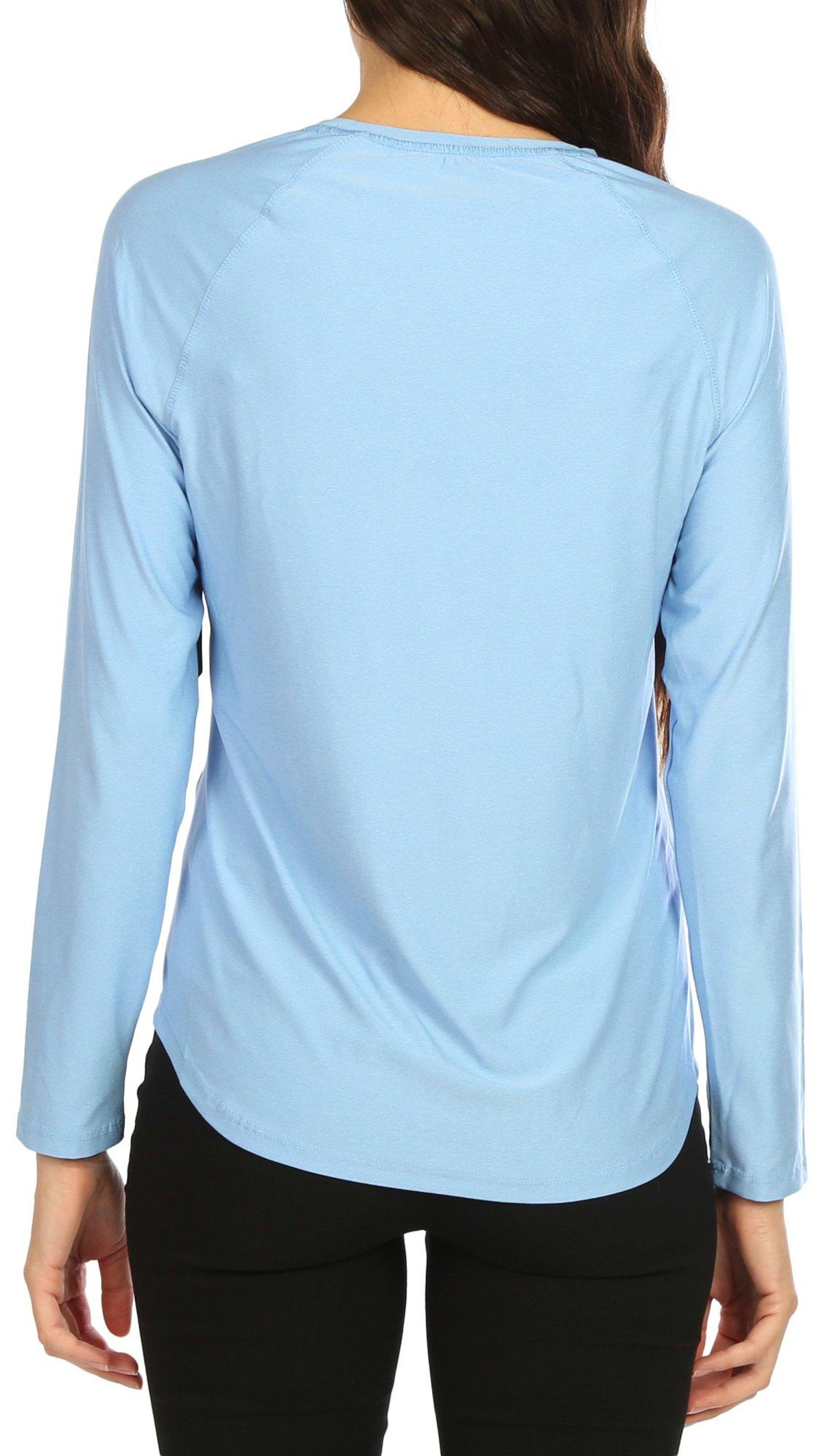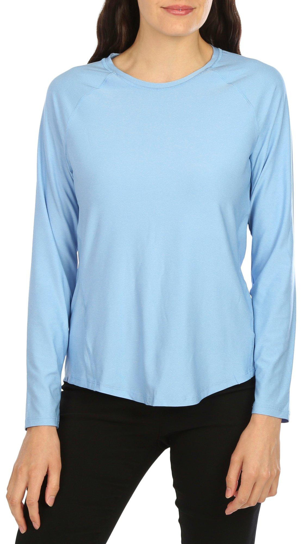 Stay comfortable and protected with our Womens Long Sleeve Crew Heathered Raglan Top! This stylish top features a solid color design and a classic crew neckline. Made from a polyester/spandex blend, it offers moisture-wicking properties to keep you dry and UPF 50 protection to shield your skin from harmful UV rays. Perfect for active days or casual outings, this top combines functionality and style for your everyday wardrobe!