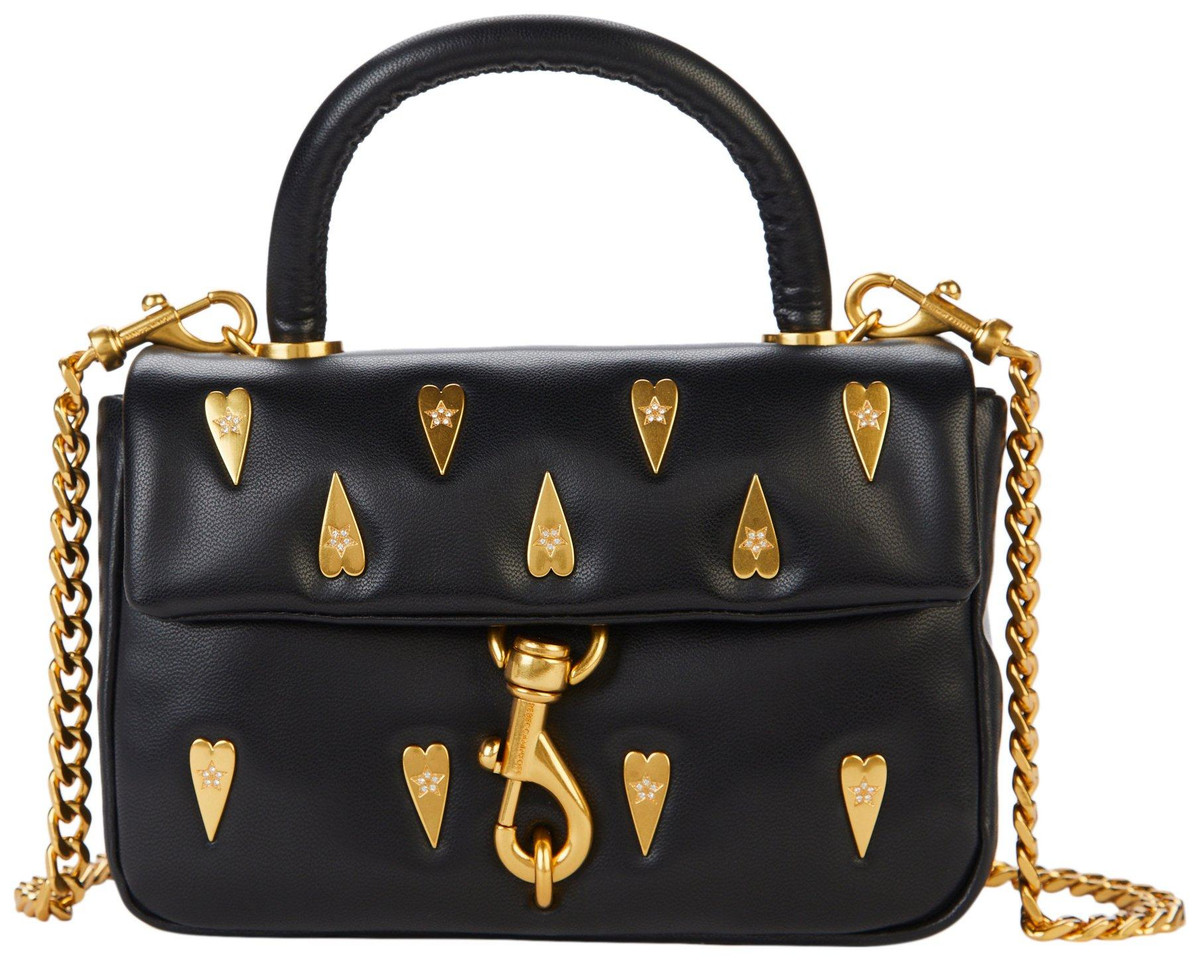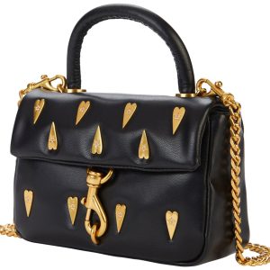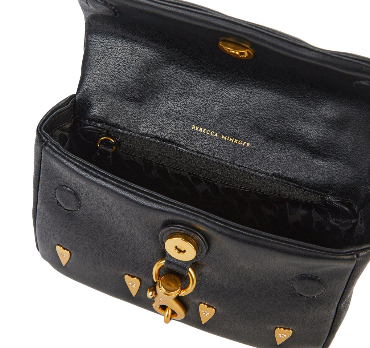 Elevate your style with the Heart Stud Edie Top Handle Crossbody. Crafted in luxe leather, it features a chic front flap with magnetic snap, gold-tone hardware, and a detachable chain strap for versatile wear. The lined interior includes a zip pocket for essentials, blending elegance and function in one timeless piece. Measures 7.5 in x 3 in x 6 in