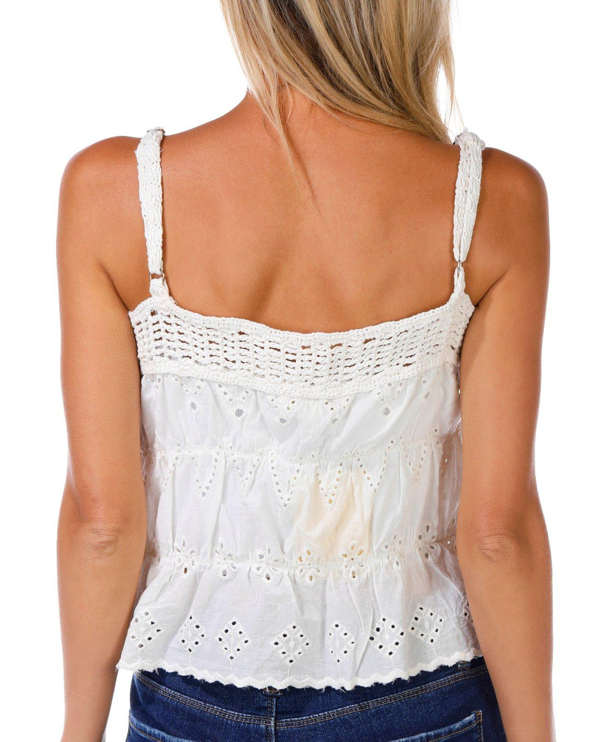 This juniors cami blends sweet and stylish with its solid color and delicate eyelet details. Adjustable straps ensure a custom fit while the double tie front adds a playful finish. A soft knit feel makes it perfect for layering or wearing solo. Fabrication 100% cotton