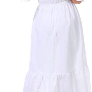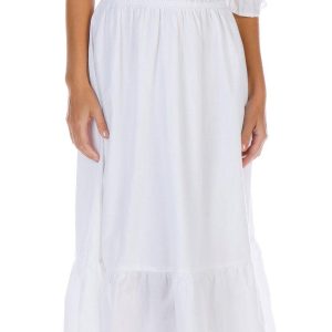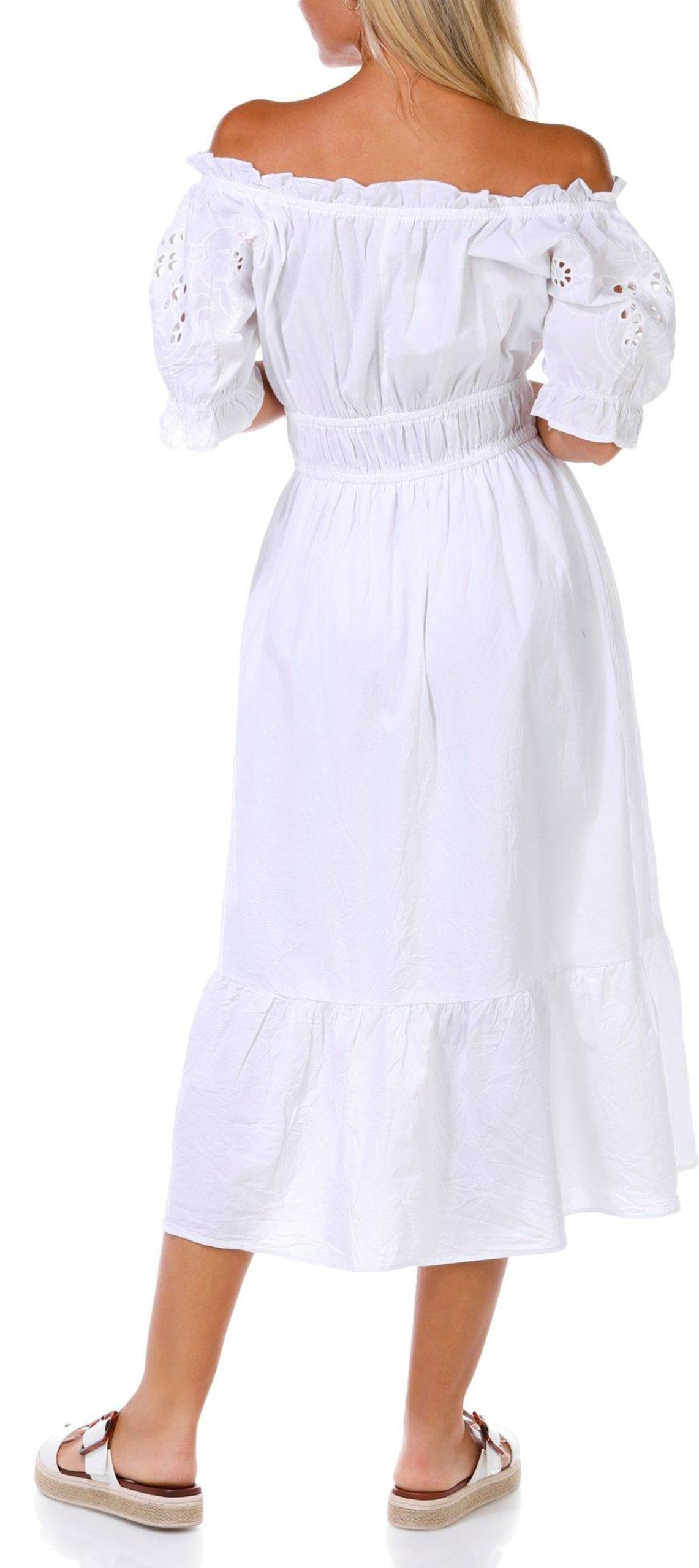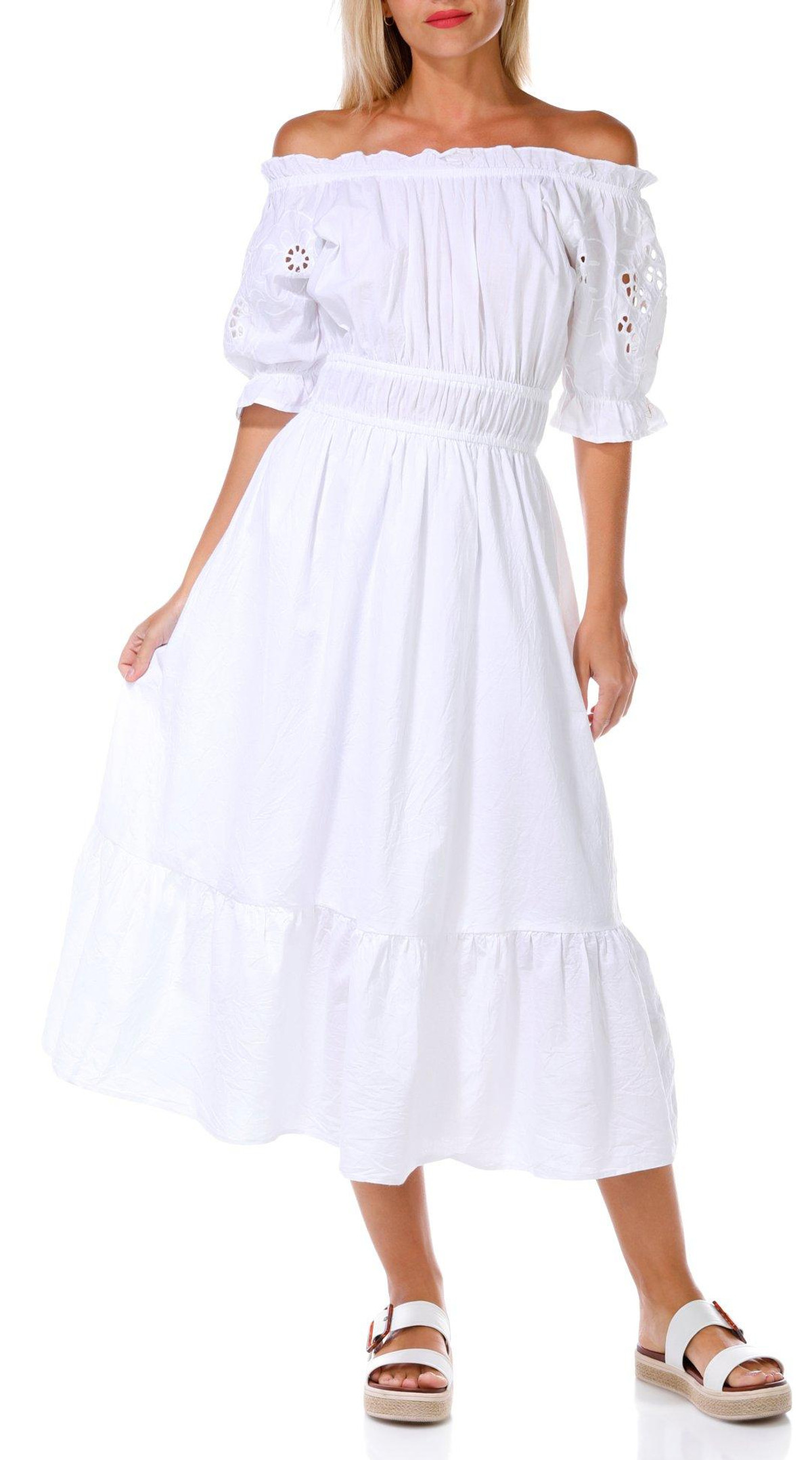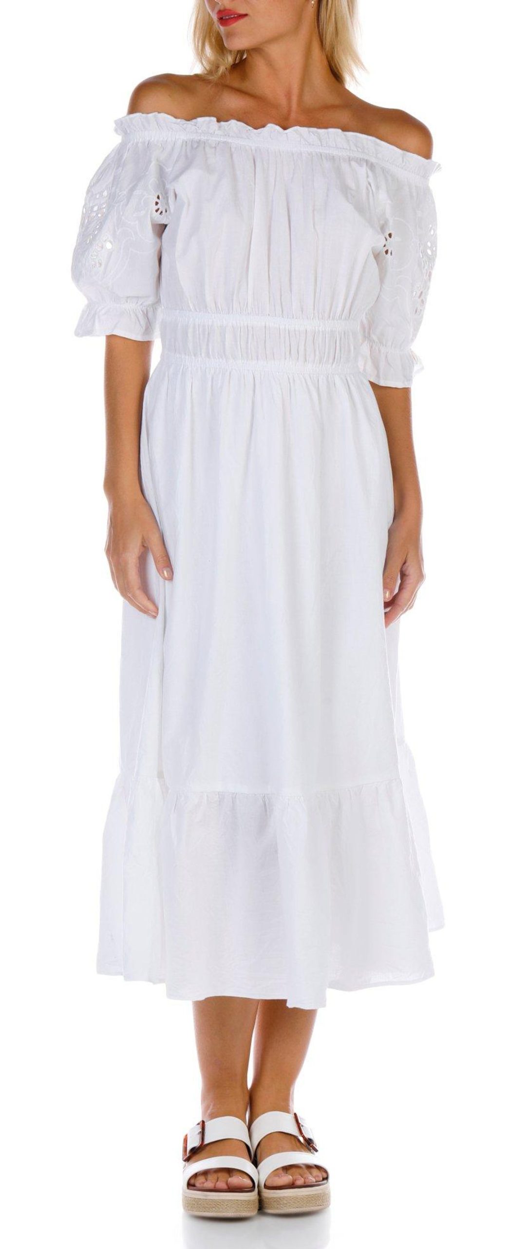 This juniors midi dress brings effortless charm with its solid color and off the shoulder design. Eyelet details accent the short sleeves for a delicate touch, while the tiered silhouette and ruffle hem add graceful movement. Fabrication 100% cotton