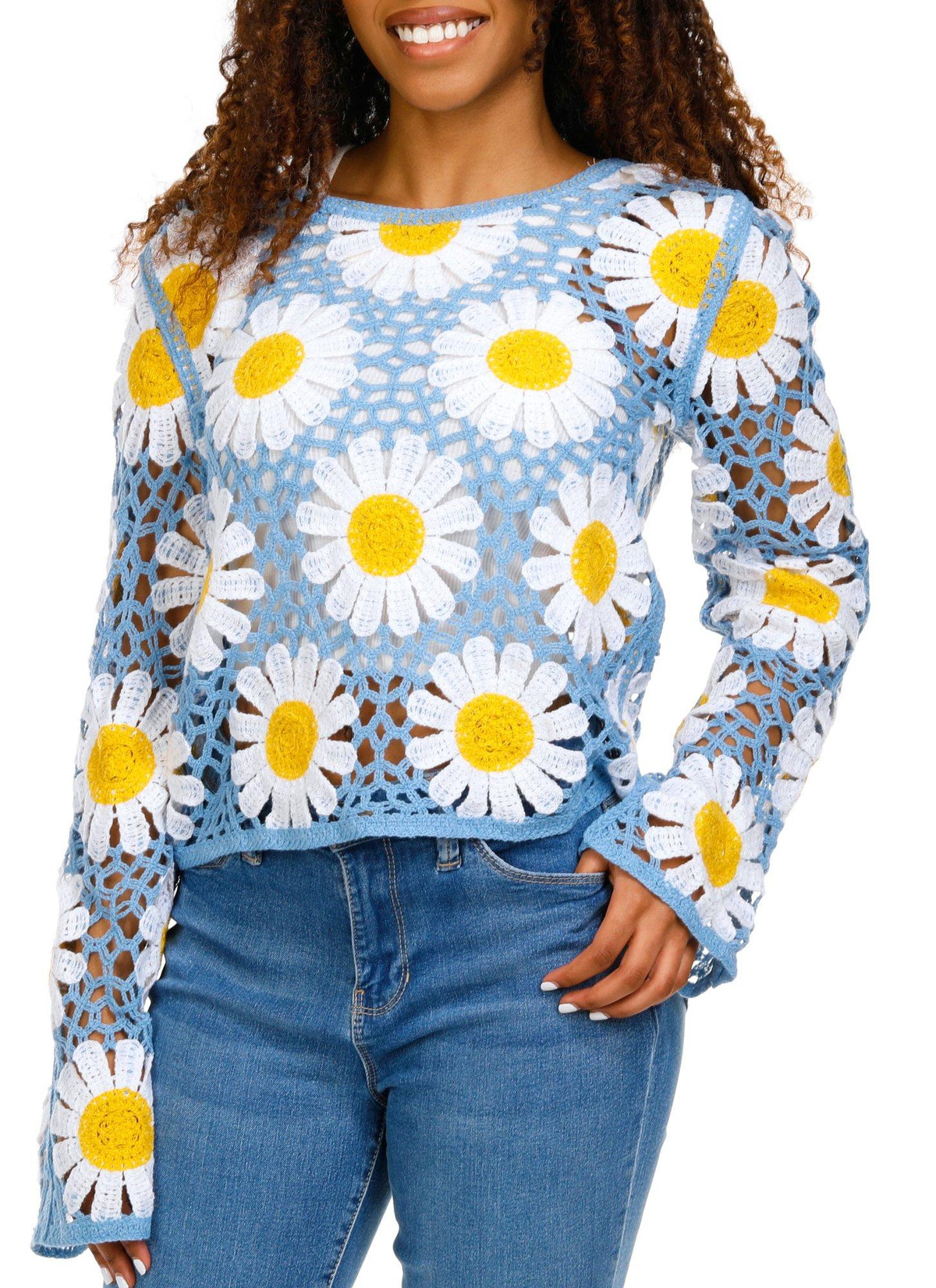 Add a touch of charm to your wardrobe with our Juniors Long Sleeve Crochet Daisy Top. Made from 100% acrylic, this top features a stylish crochet daisy design that adds a delicate and feminine touch. The round neckline and long sleeves provide a classic look, making it perfect for layering. Ideal for any casual outing or as a cozy layer, this top is a versatile and chic addition to your collection.