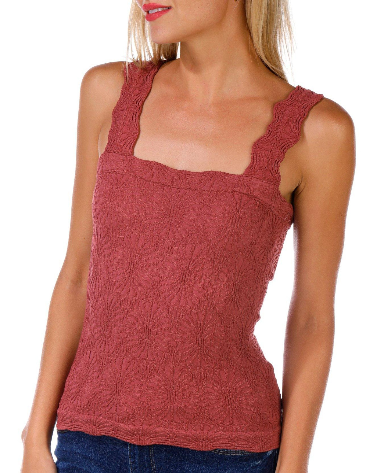 This juniors sleeveless top features a seamless design in a solid color with a soft floral pattern. The scalloped hem adds a delicate finish, making it a perfect choice for layering or wearing on its own for a clean and comfy look. Fabrication 47% nylon, 47%, 6% spandex
