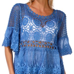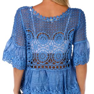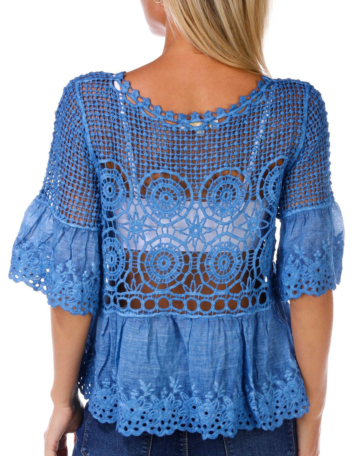 This juniors top features a stylish open crochet design with short sleeves and a relaxed fit. The washed fabric detail on the hem adds a soft, lived in look that blends comfort with effortless style, perfect for layering or wearing on its own. Fabrication 100% cotton
