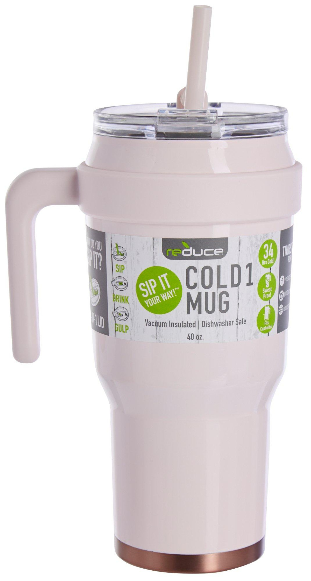 Eliminate the clutter in your life and get a stylish water saving accessory from the eco-friendly brand Reduce. This vacuum-insulated stainless steel mug is sweat-proof and features an easy to hold handle and a solid design. Includes a 3-in-1 lid and straw. Holds 40 oz.