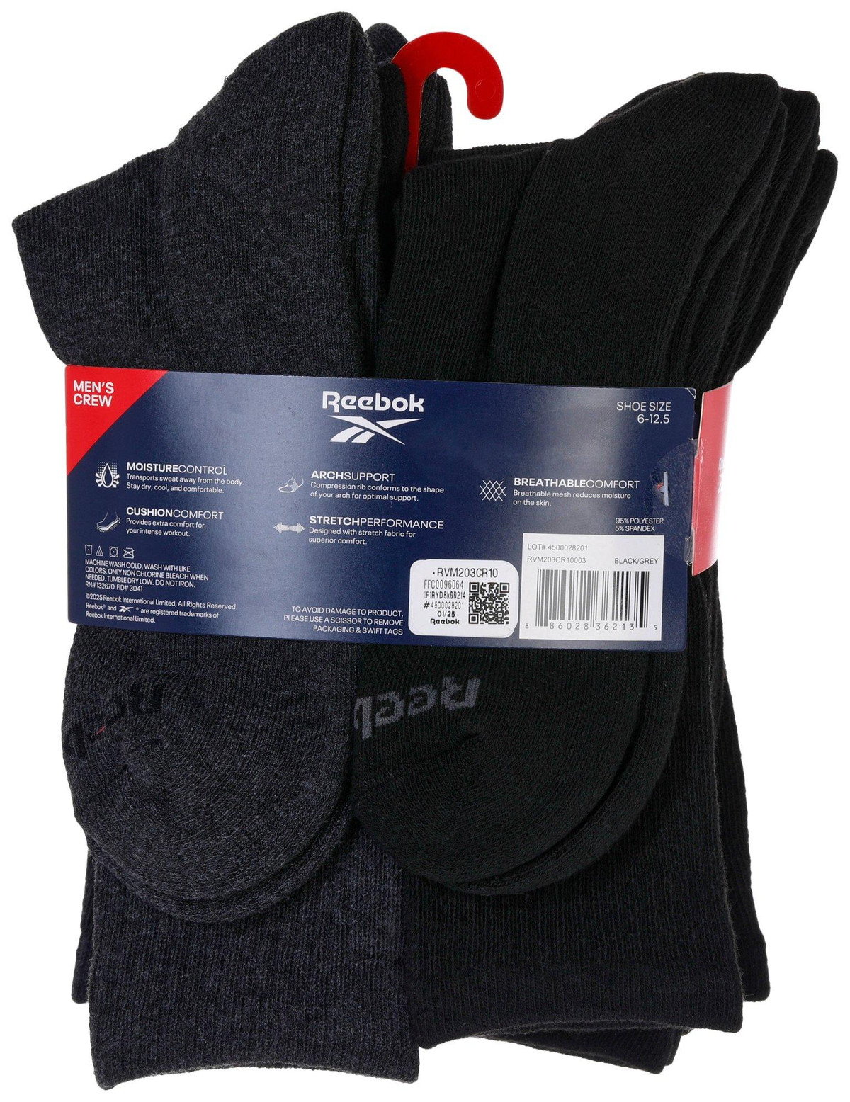 Treat your feet right with these half cushion, stretch crew socks, with moisture control for cool comfort all day. Sock size 10-13 fits shoe size 6-12. Fabrication 95% polyester, 5% spandex.