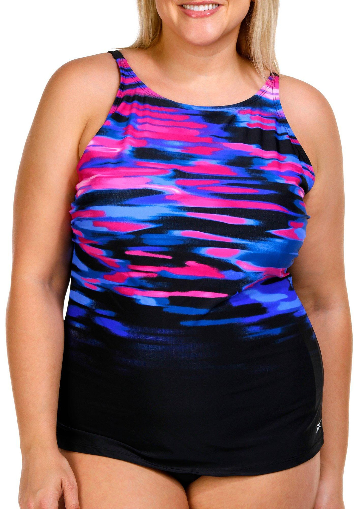 Introducing the Plus High Neck Tankini Top, expertly crafted from a blend of nylon and spandex for a comfortable and flattering fit. This stylish swimwear features a chic print, adjustable straps for a customized fit, and an internal shelf bra for added support. The high neckline adds a touch of elegance, making it perfect for both beach days and poolside lounging.