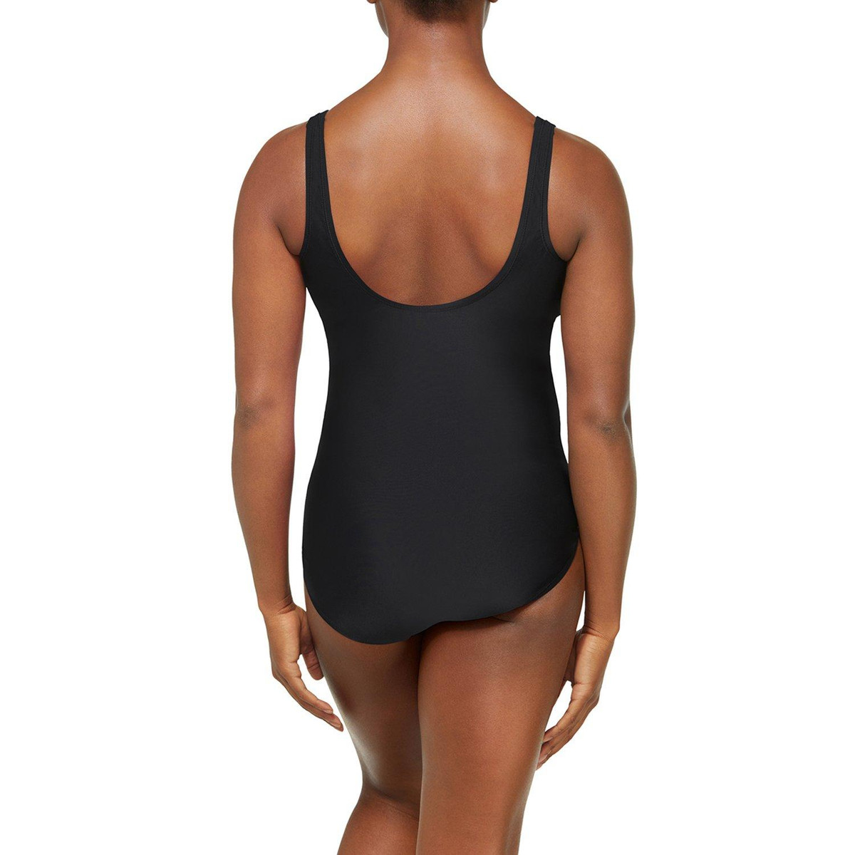 This one-piece sport swimsuit features a colorful diagonal design, a scoop neckline, molded cups, fixed straps, antimicrobial and chlorine-resistant technologies, tummy control, and a U-back. Fabrication 81% nylon, 19% spandex.