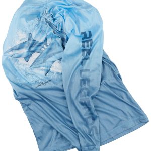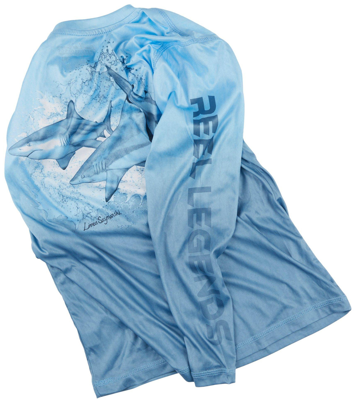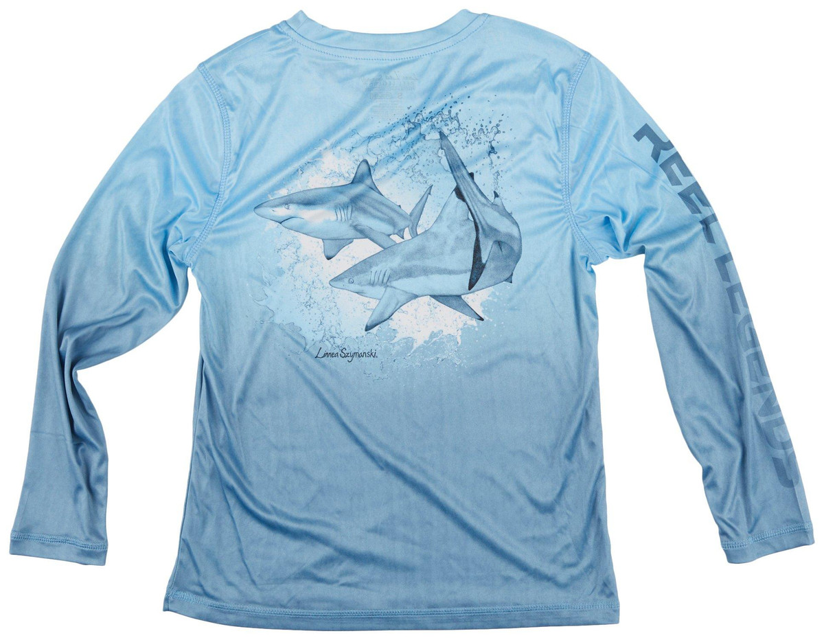Introducing the Big Boys Long Sleeve Rash Guard, designed for ultimate performance and style. Made from 100% polyester, this rash guard features the brand script on the front and a striking graphic shark print on the back. With a crew neckline and long sleeves, it offers a comfortable fit and performance stretch. Enjoy UPF 50 sun protection, quick-dry technology, moisture-wicking fabric, and sweat-activated cooling for all-day comfort. Perfect for active adventures!