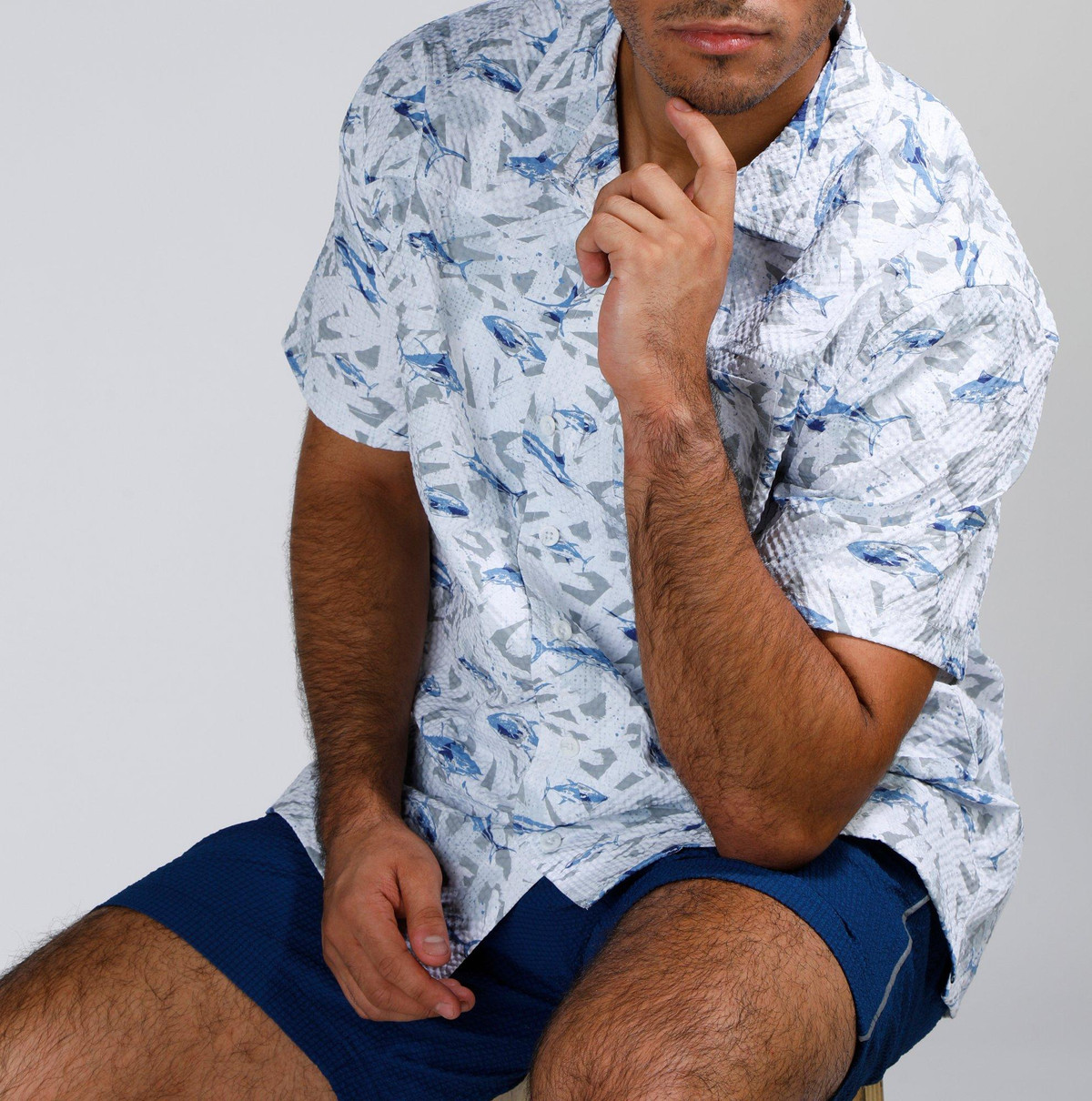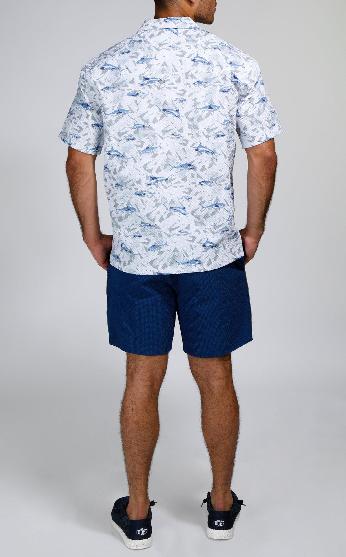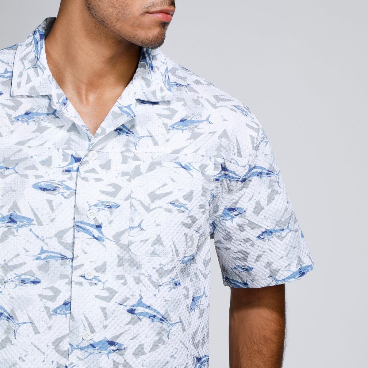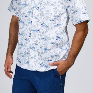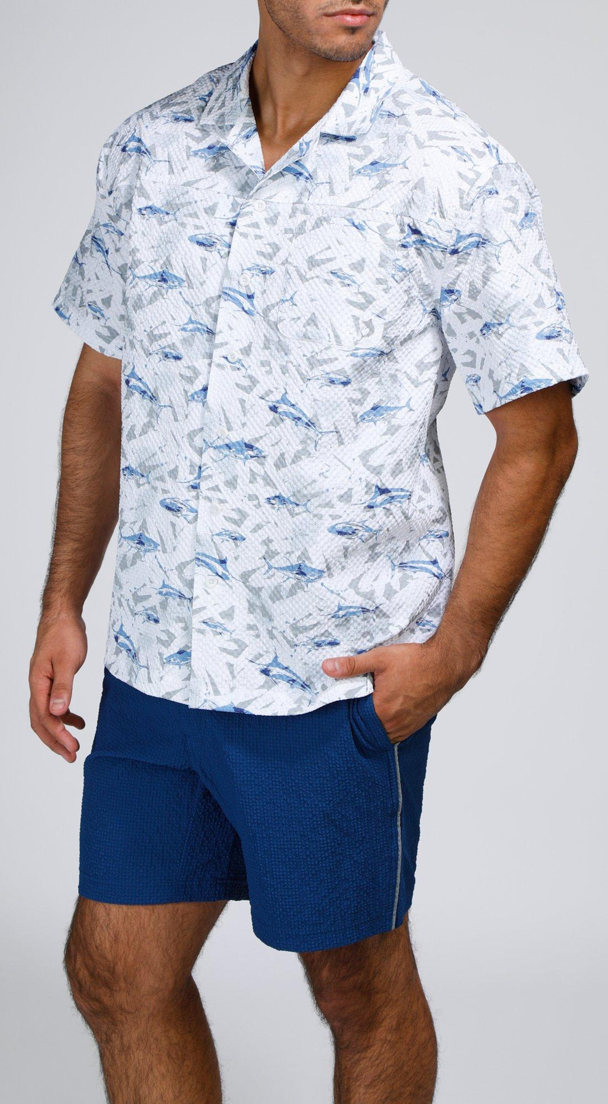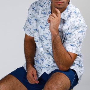 Make waves in style with our Men’s Seersucker Shark Printed Button-Up Shirt. Crafted from 100% polyester, this lightweight, textured shirt features a playful shark print and breathable seersucker fabric for all-day comfort. Perfect for beach days, barbecues, or casual summer outings.