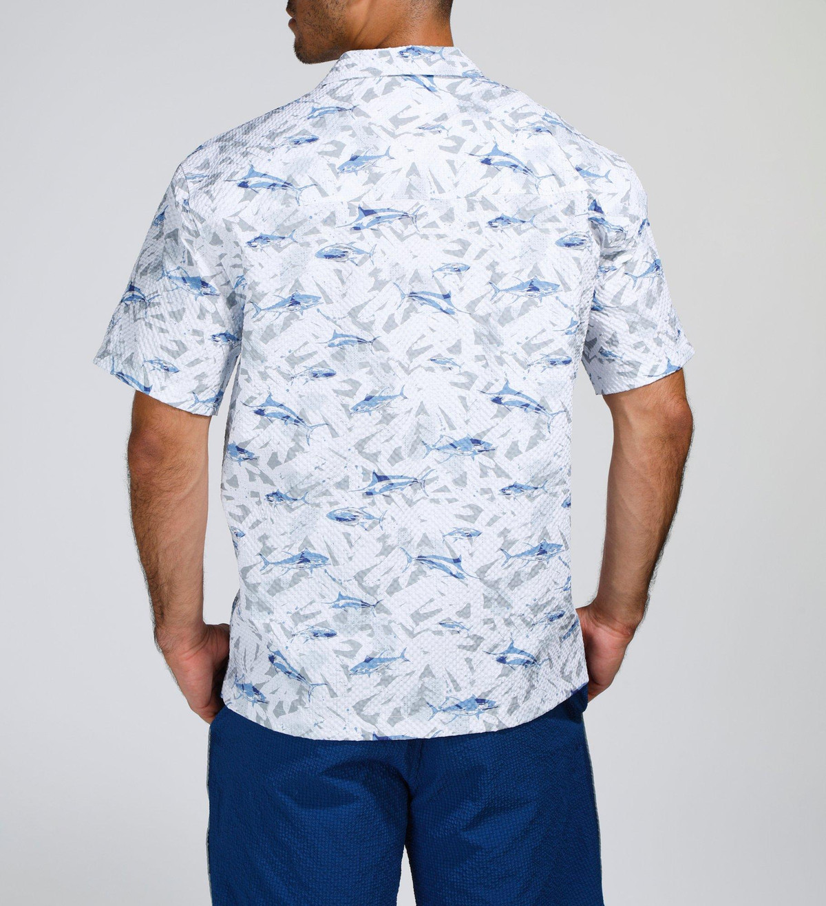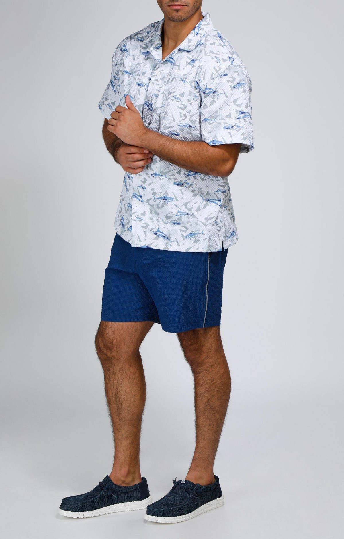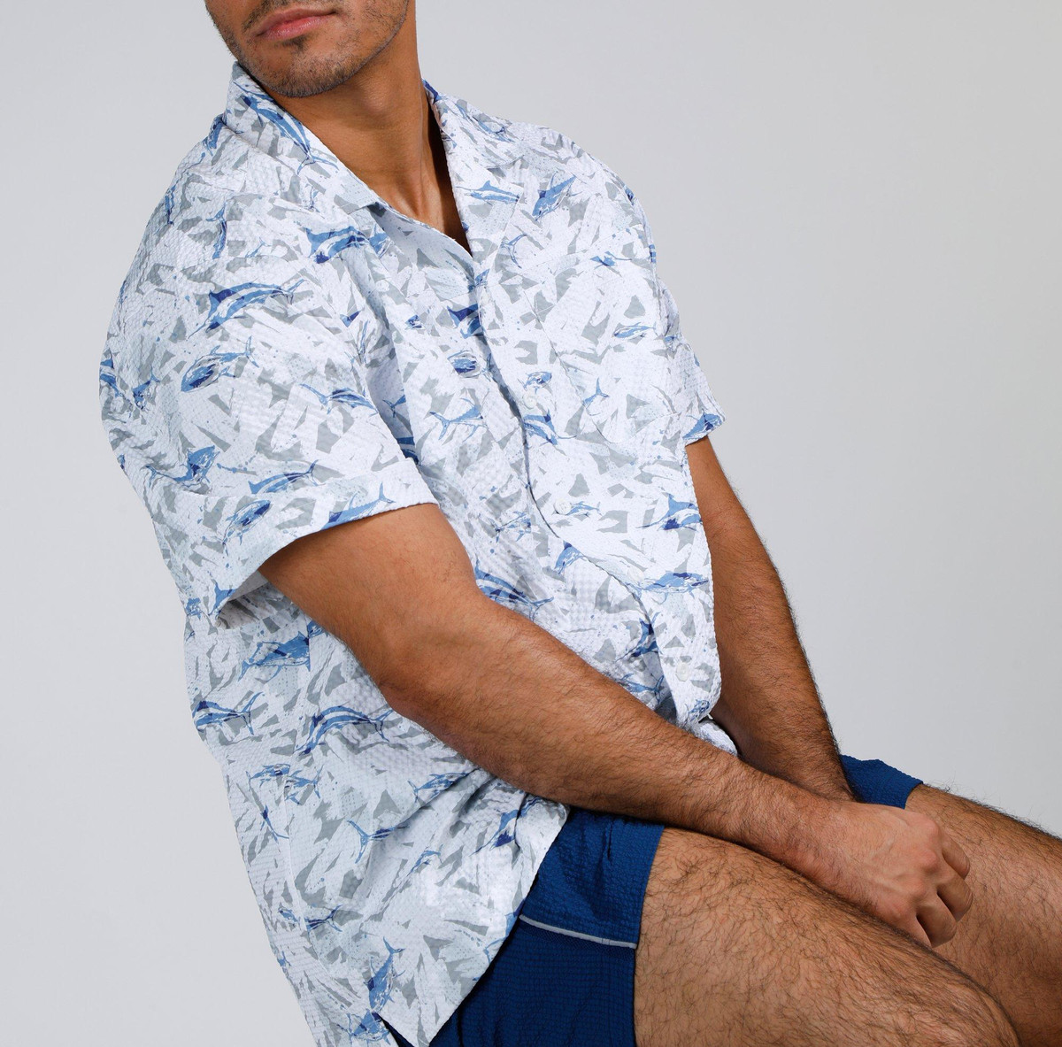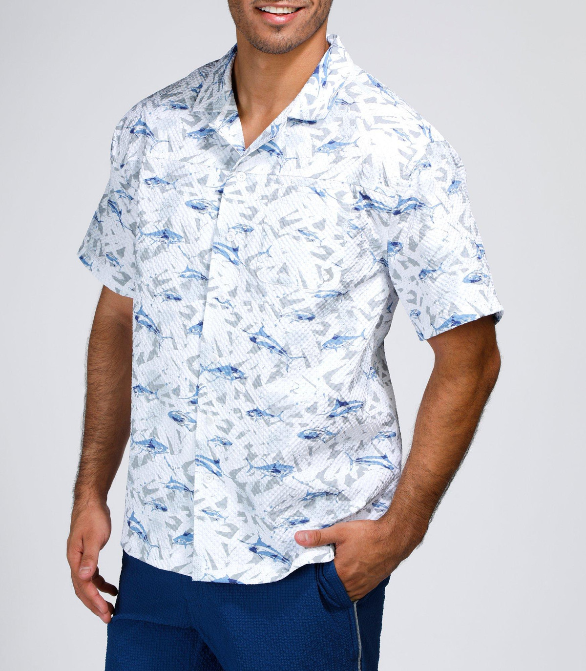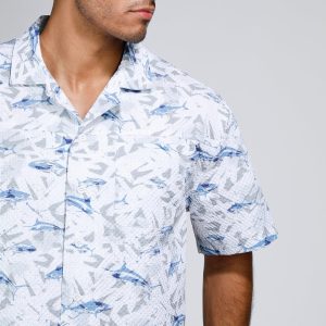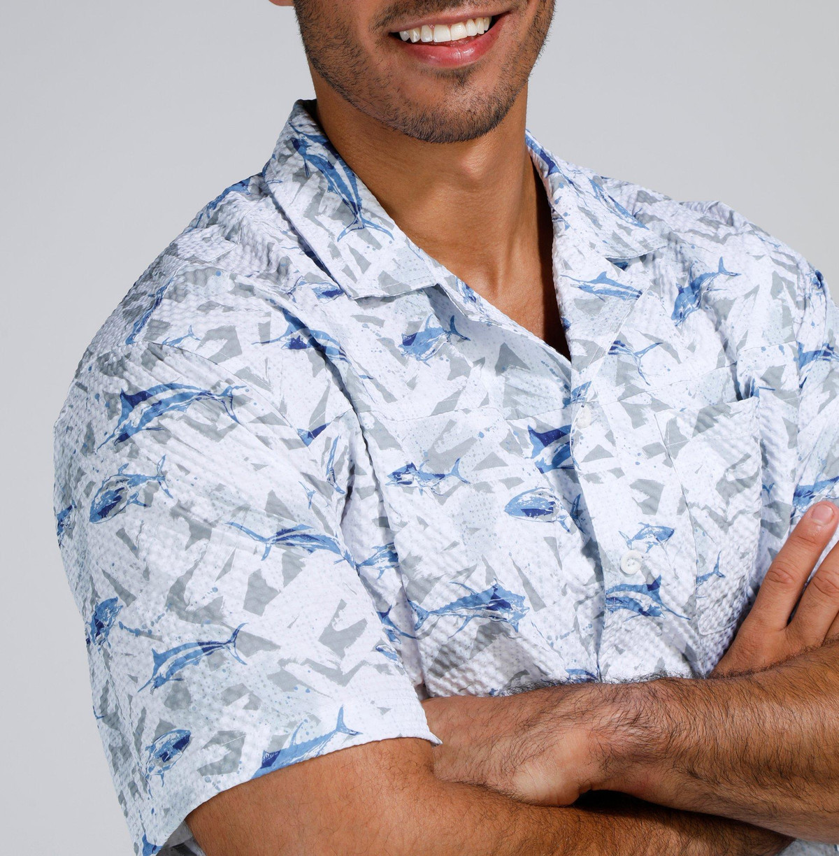 Make waves in style with our Men’s Seersucker Shark Printed Button-Up Shirt. Crafted from 100% polyester, this lightweight, textured shirt features a playful shark print and breathable seersucker fabric for all-day comfort. Perfect for beach days, barbecues, or casual summer outings.