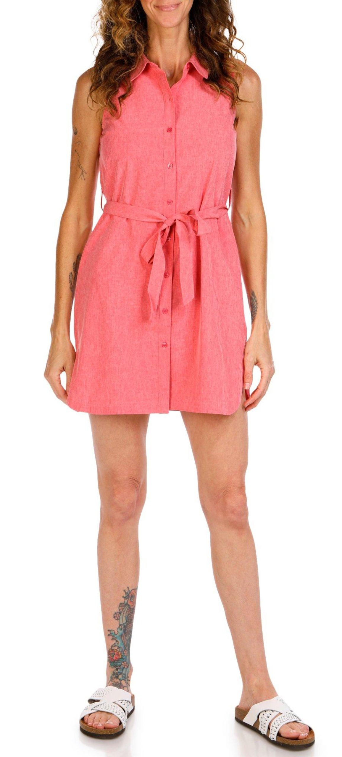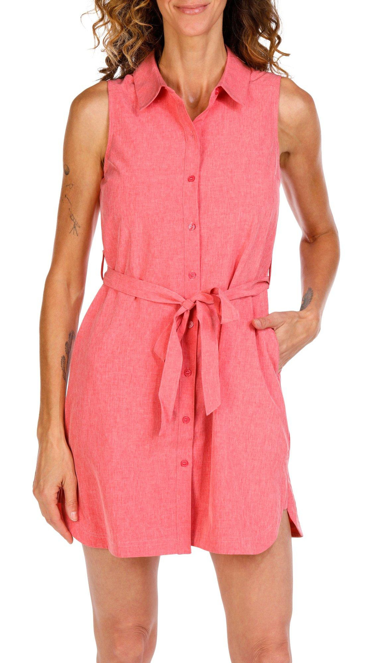 This petite outdoor sleeveless woven dress is designed for warm weather adventures. It features a button down front, point collar, and waist tie for a flattering fit. With UPF 50 plus protection, moisture wicking, and quick dry fabric, it keeps you cool and comfortable all day. Fabrication 92% polyester, 8% spandex