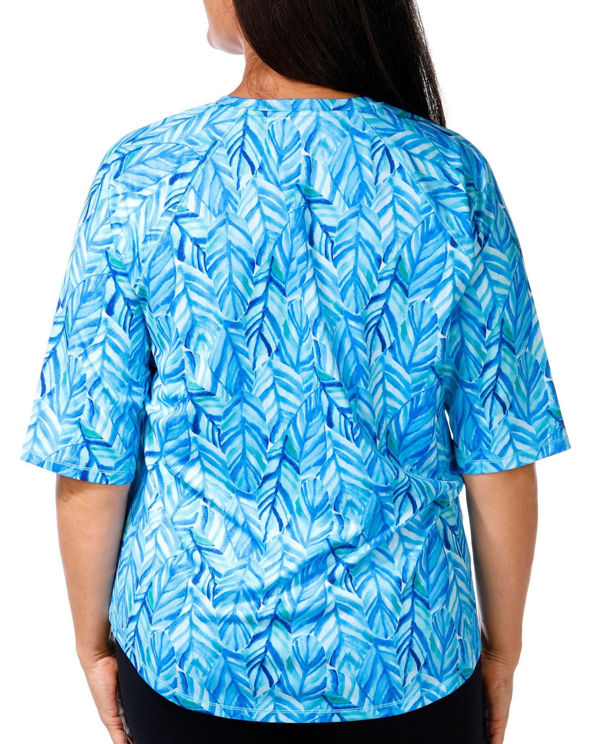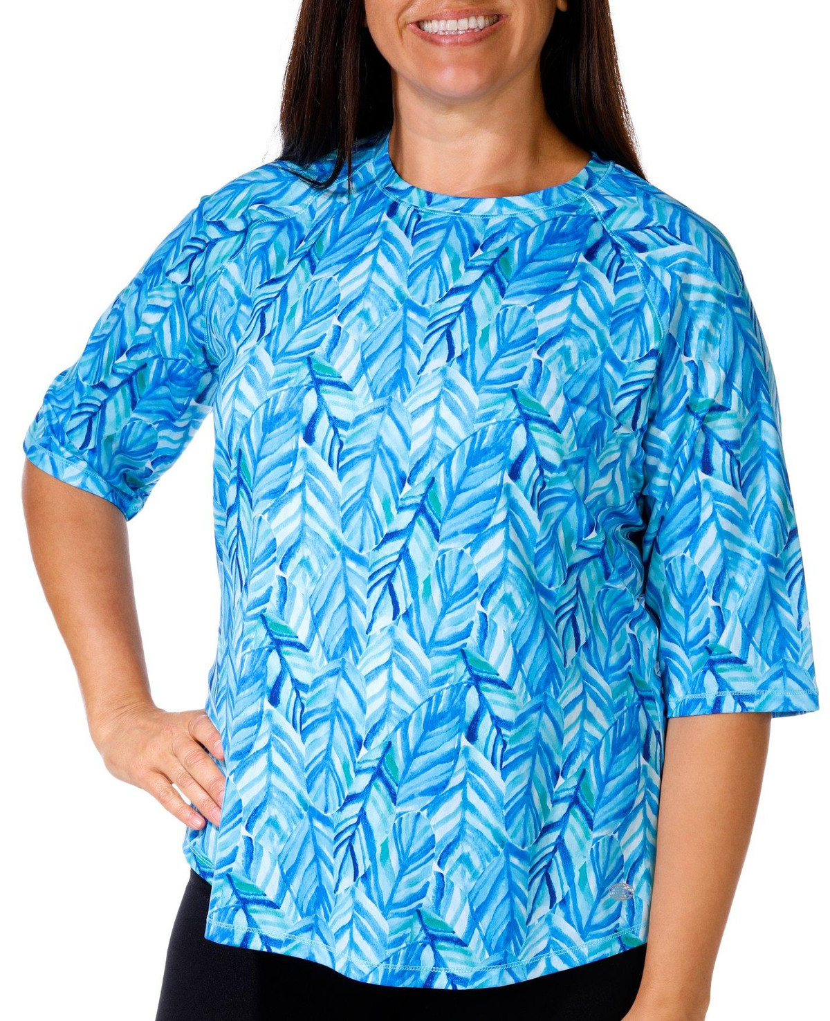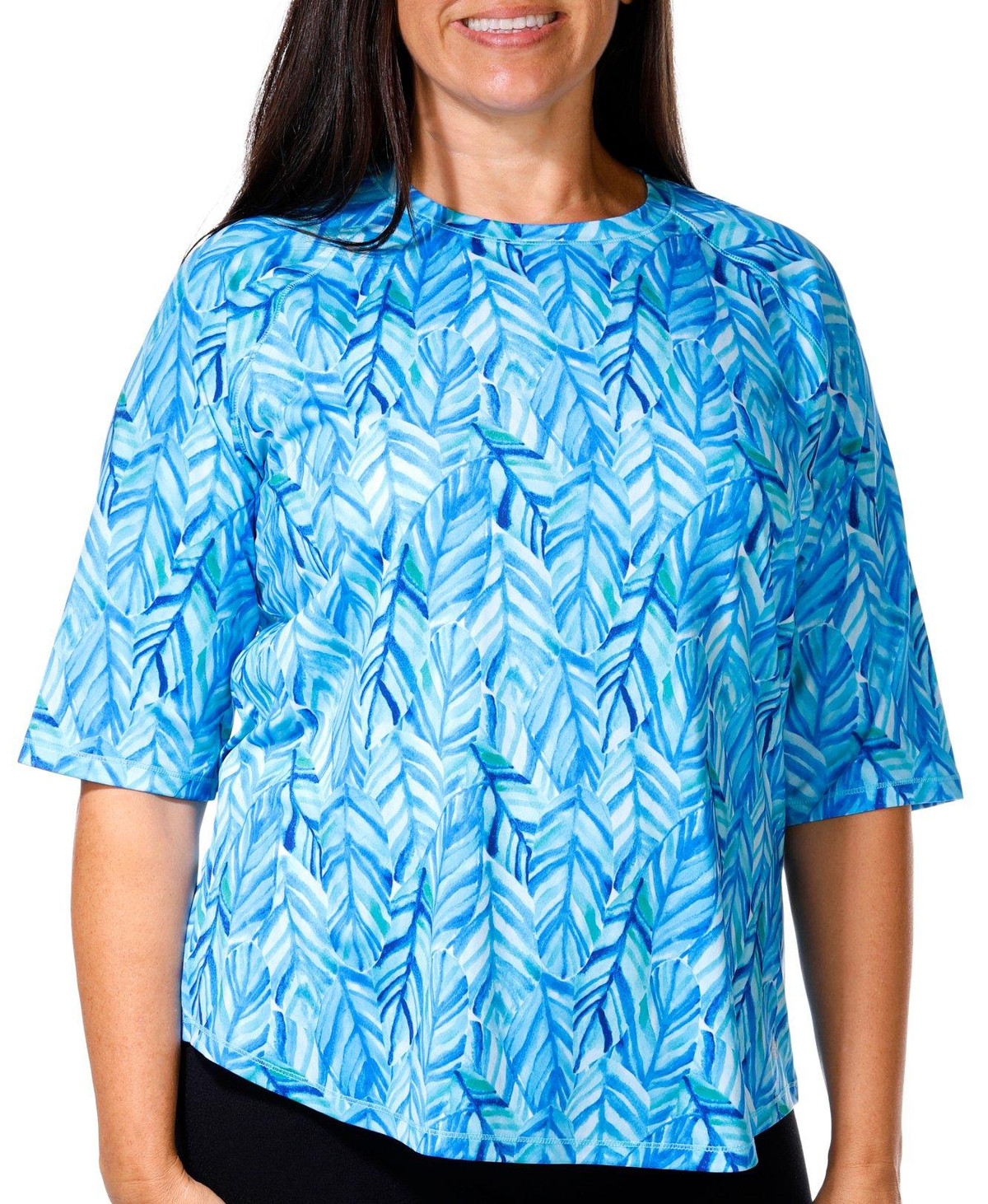 Discover the outdoors in this top! The bright abstract print design exudes coastal charm. Made from soft, lightweight stretch knit fabric, this top ensures maximum comfort and flexibility for all your outdoor adventures. A round neckline adds a touch of classic style, making it perfect for both active and casual wear. Fabrication is 92% recycled polyester, 8% spandex.