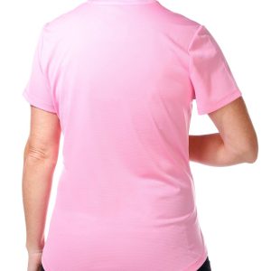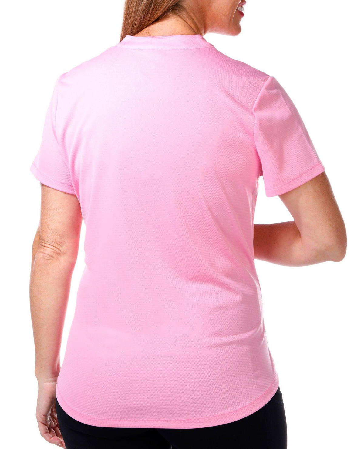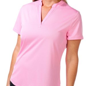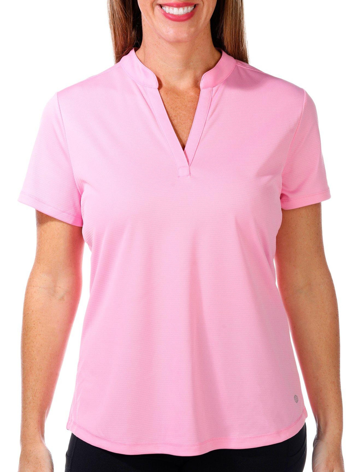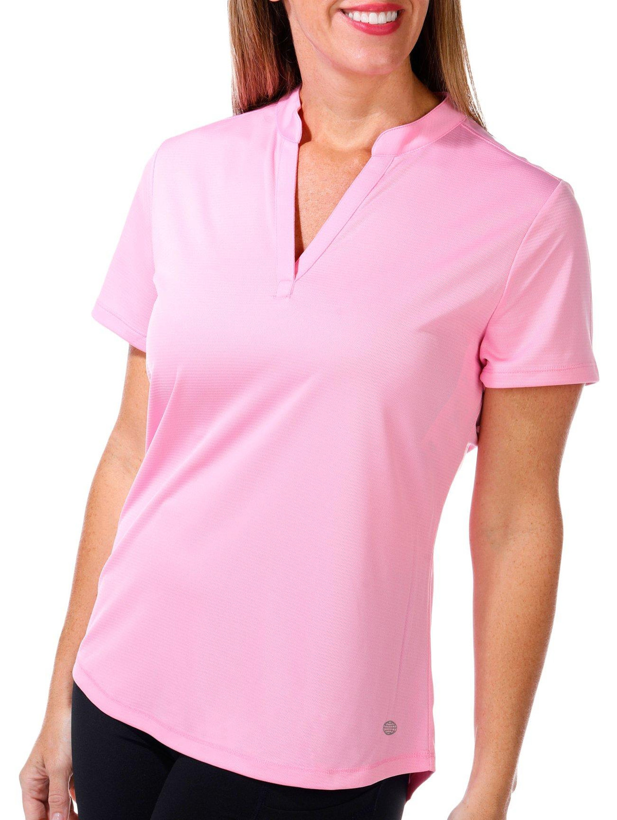 Reel Legends offers performance designs to support the active lifestyle. This short sleeve top features a solid color design on lightweight freeline fabric like line running through, a v-neckline with mandarin collar, hi-low curved back hemline, solid color for effortless matching, and comfortable fit. The top length measures approximately 25 in front hemline. Fabrication 100% polyester.