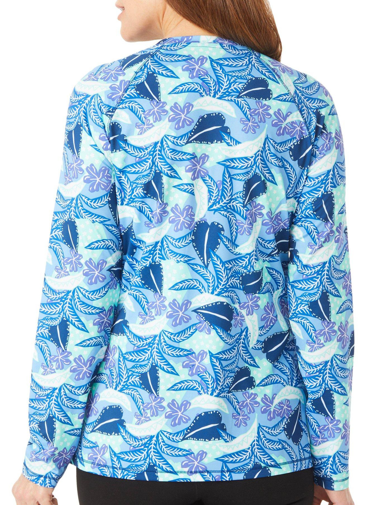 Reel Legends apparel is perfect for any land or sea adventure. This Reel-Tec top features a print design on lightweight stretch smooth satin touch knit fabric, long solid sleeves, a round neckline, moisture-wicking, quick-dry, and sweat-activated technologies, snag resistance, and UPF 50 sun protection. The top length measures approximately 26 in. Fabrication 92% recycled polyester, 8% spandex.