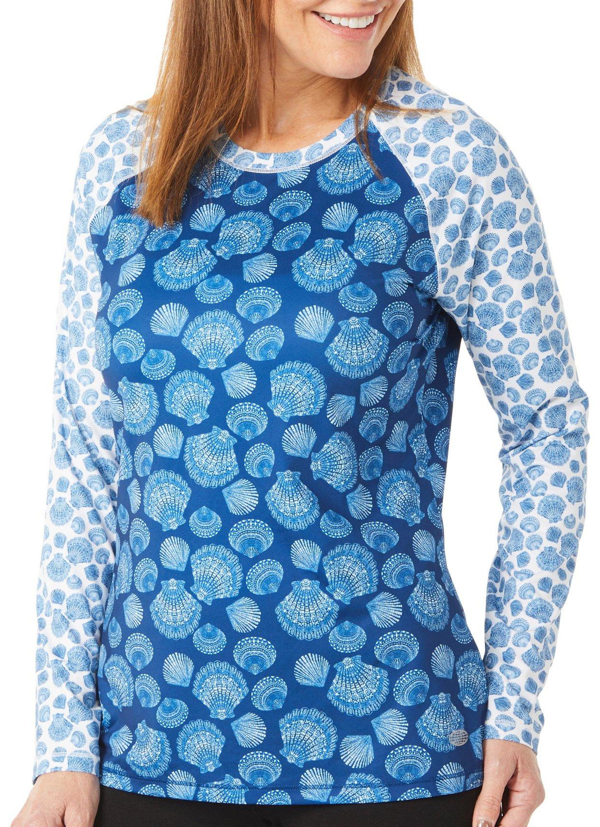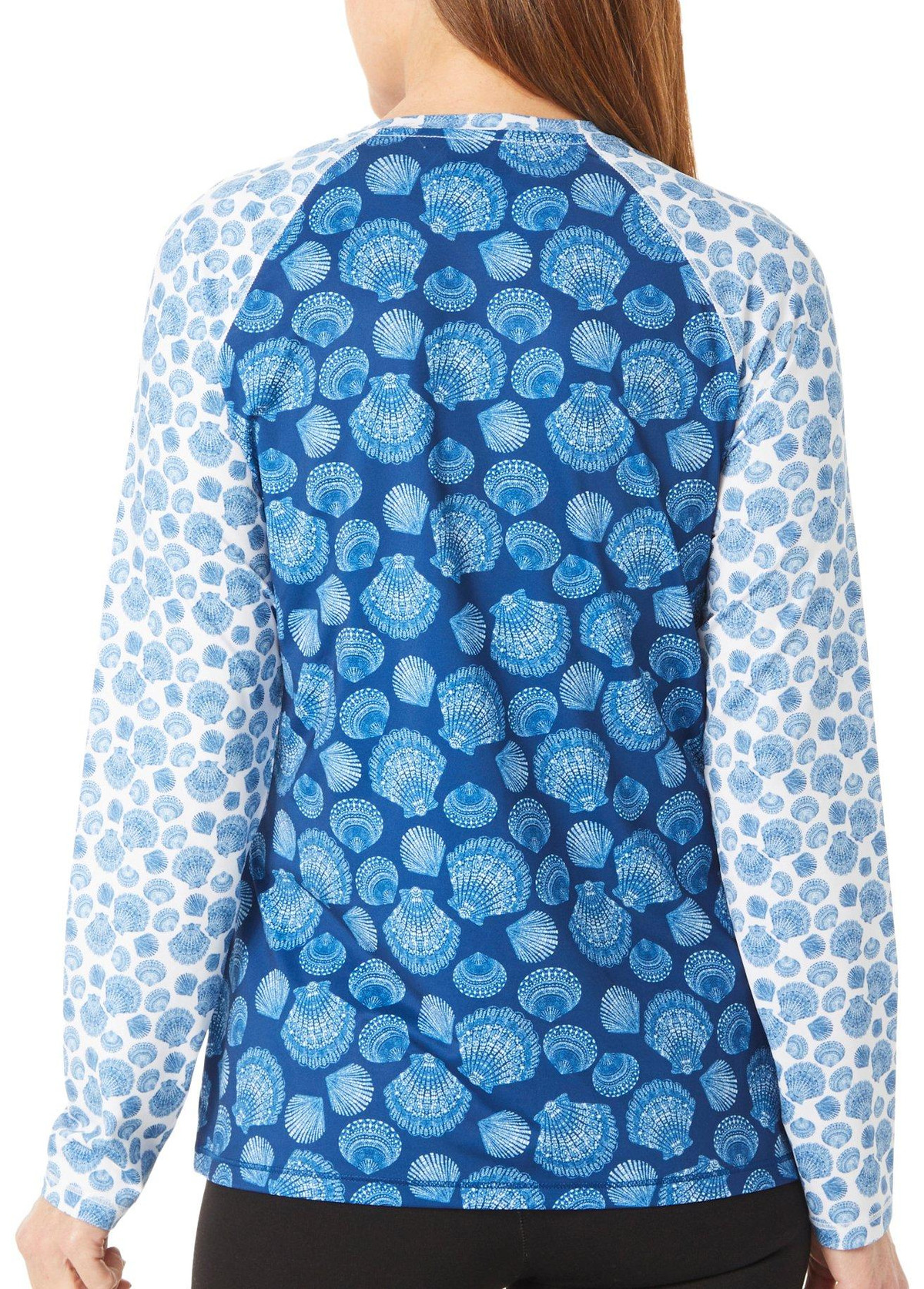This Reel-Tec top features a print design on lightweight stretch smooth satin touch knit fabric, long solid sleeves, a round neckline, moisture-wicking, quick-dry, and sweat-activated technologies, snag resistance, and UPF 50 sun protection. The top length measures approximately 26 in. Fabrication 92% recycled polyester, 8% spandex.