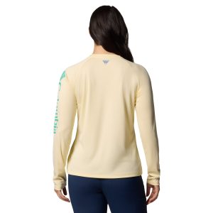 This Reel-Tec top features a print design on lightweight stretch smooth satin touch knit fabric, long solid sleeves, a round neckline, moisture-wicking, quick-dry, and sweat-activated technologies, snag resistance, and UPF 50 sun protection. The top length measures approximately 26 in. Fabrication 92% recycled polyester, 8% spandex.