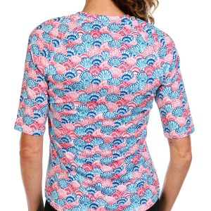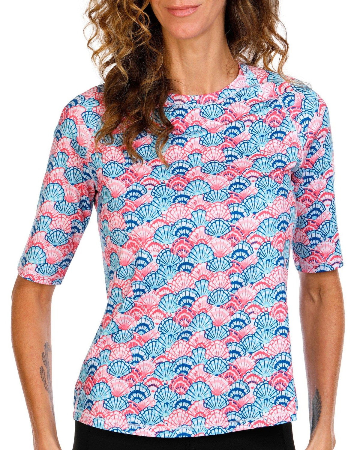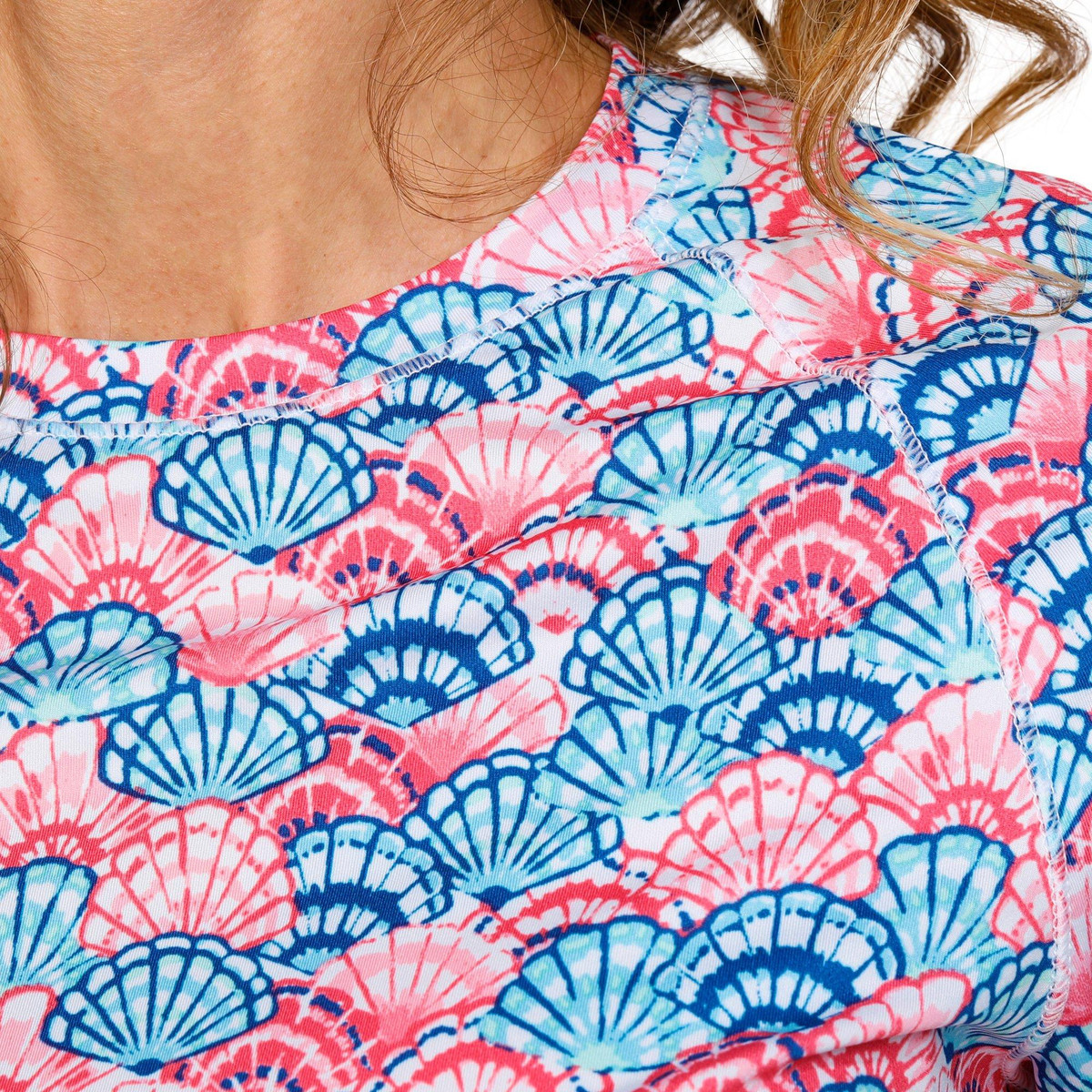 Discover the outdoors in this top! The scallop print design exudes coastal charm. Made from soft, lightweight stretch knit fabric, this top ensures maximum comfort and flexibility for all your outdoor adventures. A round neckline adds a touch of classic style, making it perfect for both active and casual wear. Embrace the outdoors in style with this versatile and elegant piece. Fabrication is 92% recycled polyester, 8% spandex.