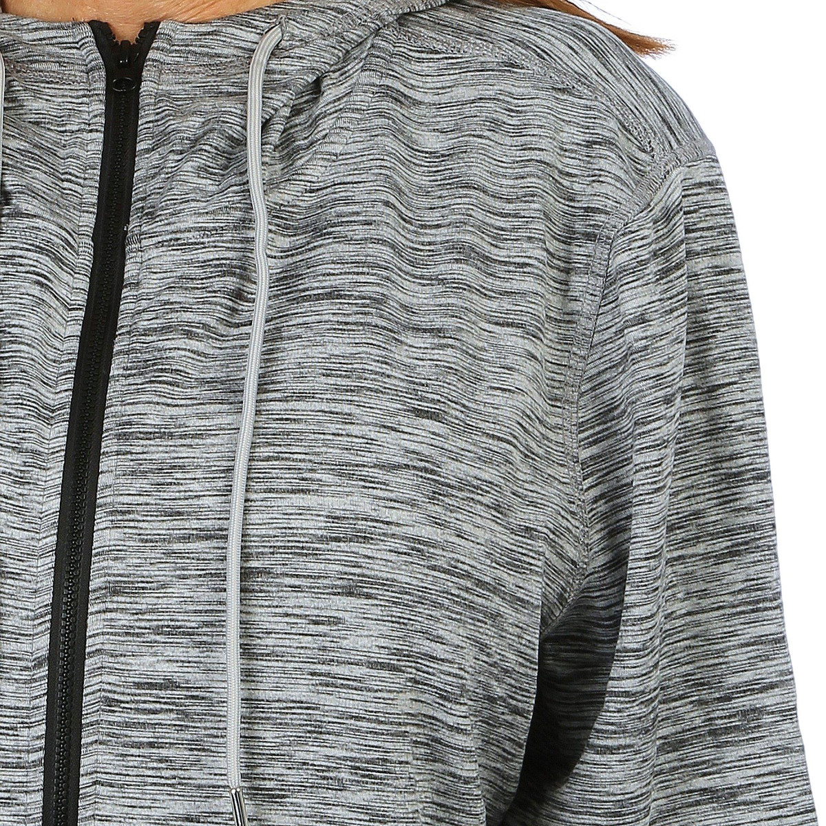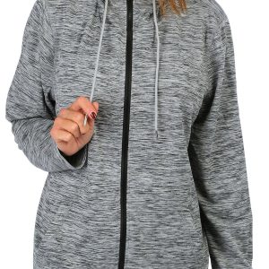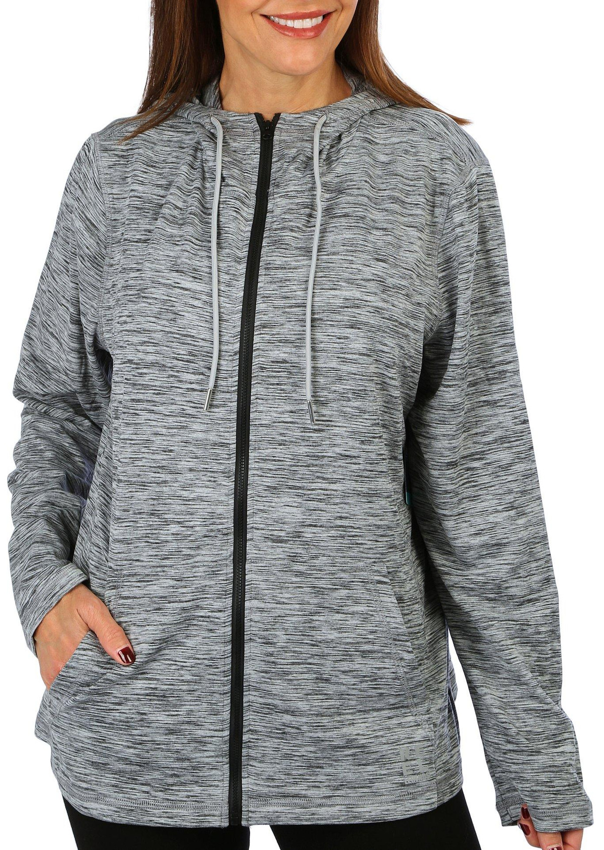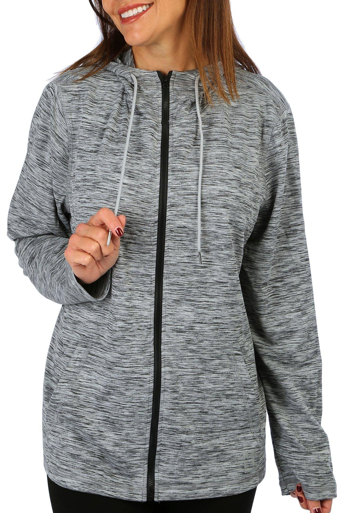 Stay warm and stylish with our Long Sleeve Hooded Jacket. This versatile piece features a solid color design and a drawstring hood for adjustable comfort. The full zip front allows for easy wear, while the double zip pockets provide secure storage for your essentials. Perfect for layering on cooler days, this jacket combines functionality and fashion effortlessly. Fabrication is 86% polyester and 14% spandex.