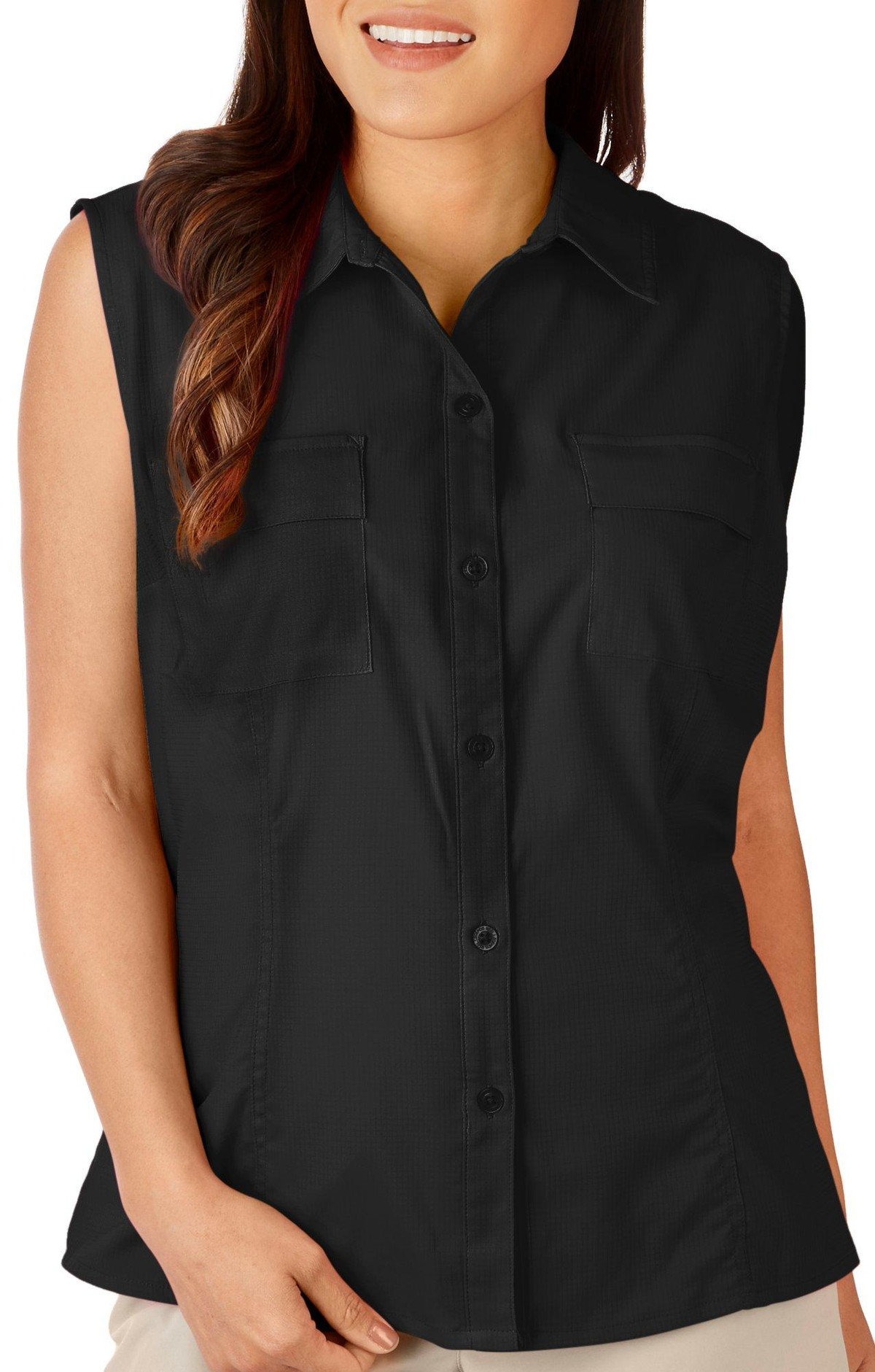 This sleeveless top features a solid color design on lightweight woven fabric, a point collar with button-down styling, dual chest pockets for extra storage, a vented back detail, moisture wicking and quick dry technology, and UPF 50+ sun protection. The top length measures approximately 26in. Fabrication 100% polyester.