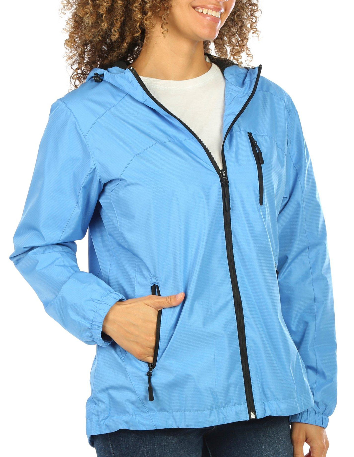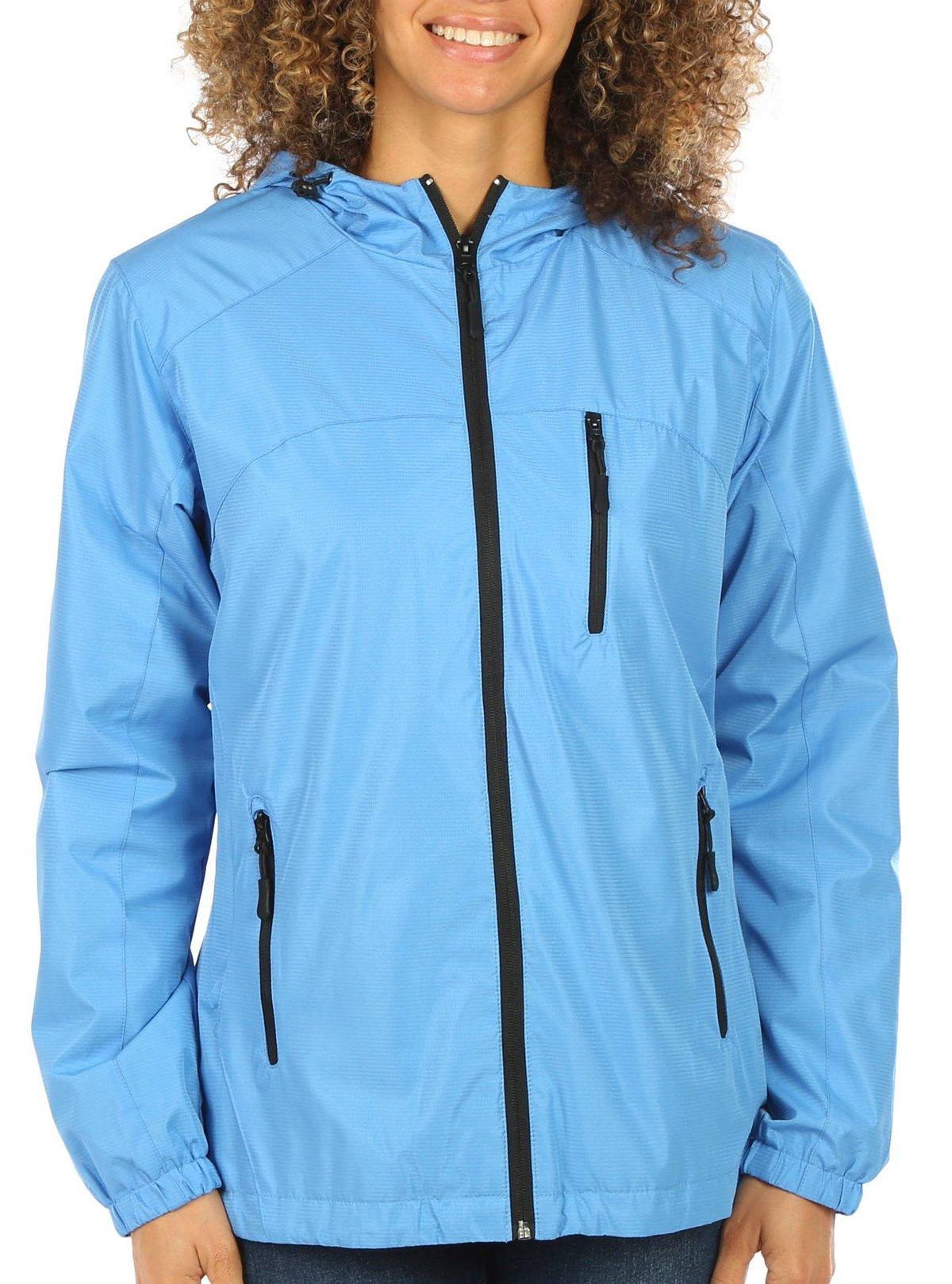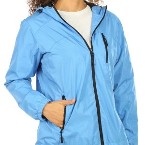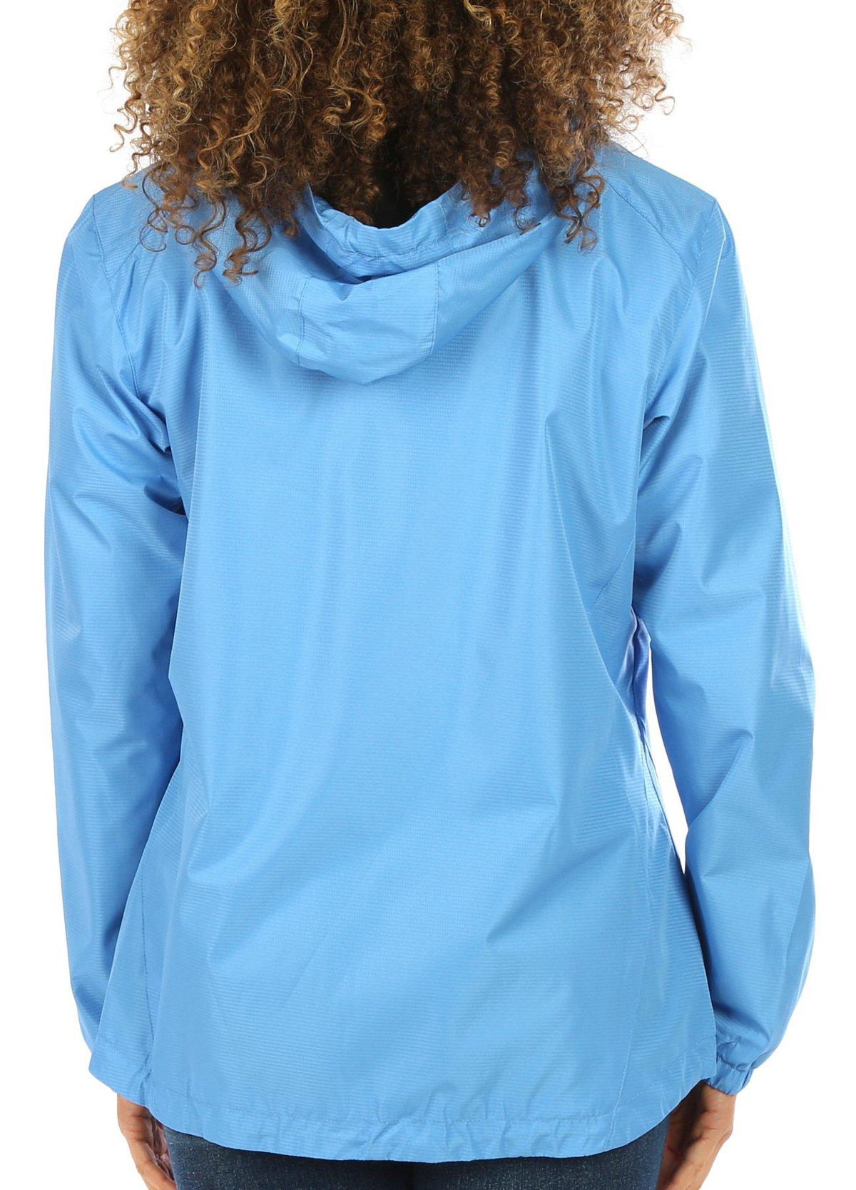 This women’s solid zip-up rain jacket is the perfect combination of style and practicality. Featuring a sleek, minimalist design, it offers full coverage with a secure zip closure and adjustable features for a custom fit. Lightweight and water-resistant, it’s ideal for staying dry in unpredictable weather. The top length measures approximately 26 in. Fabrication 100% polyester.