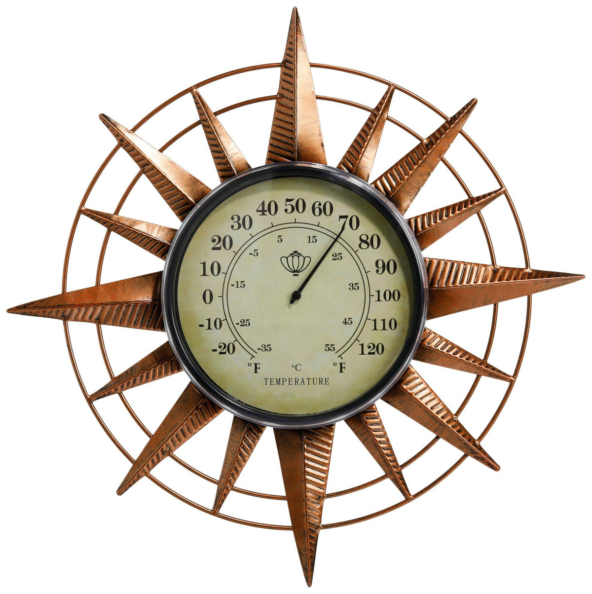 Add a splash of nautical charm to your home with this 14 in Compass Thermometer, a captivating and functional addition to your home décor. This beautifully designed thermometer features a compass motif, blending celestial charm with practical utility. It accurately displays temperature while enhancing any indoor or outdoor space. Crafted from durable materials, it is perfect for gardens, patios, or living areas. Measures approximately 14 in x 14 in x 2 in.
