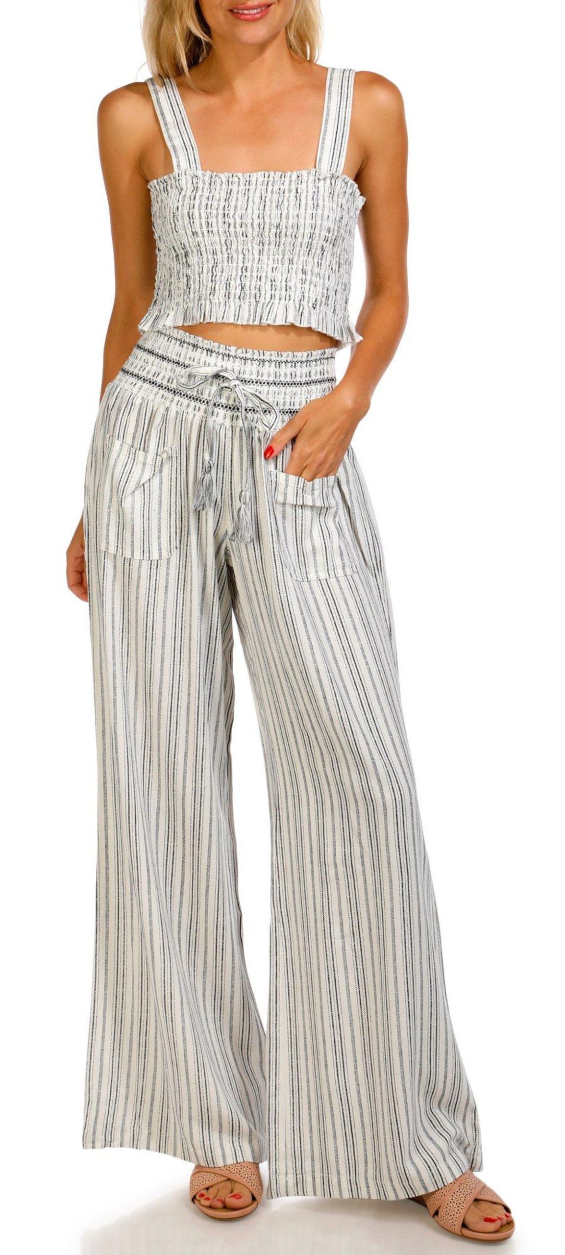 Introducing our Juniors 2 Pc Stripe Smock Pants Set, crafted from a blend of cotton, linen, and rayon. This stylish set features a chic striped print and includes a sleeve crop top with an all-over smocked design and a square neckline. The matching pants boast a smocked waistband, front pockets, and a drawstring waistband for added comfort.