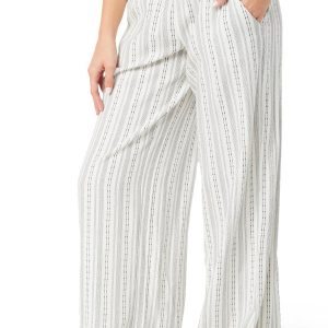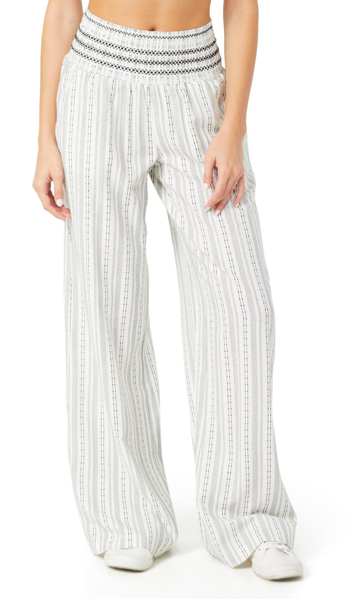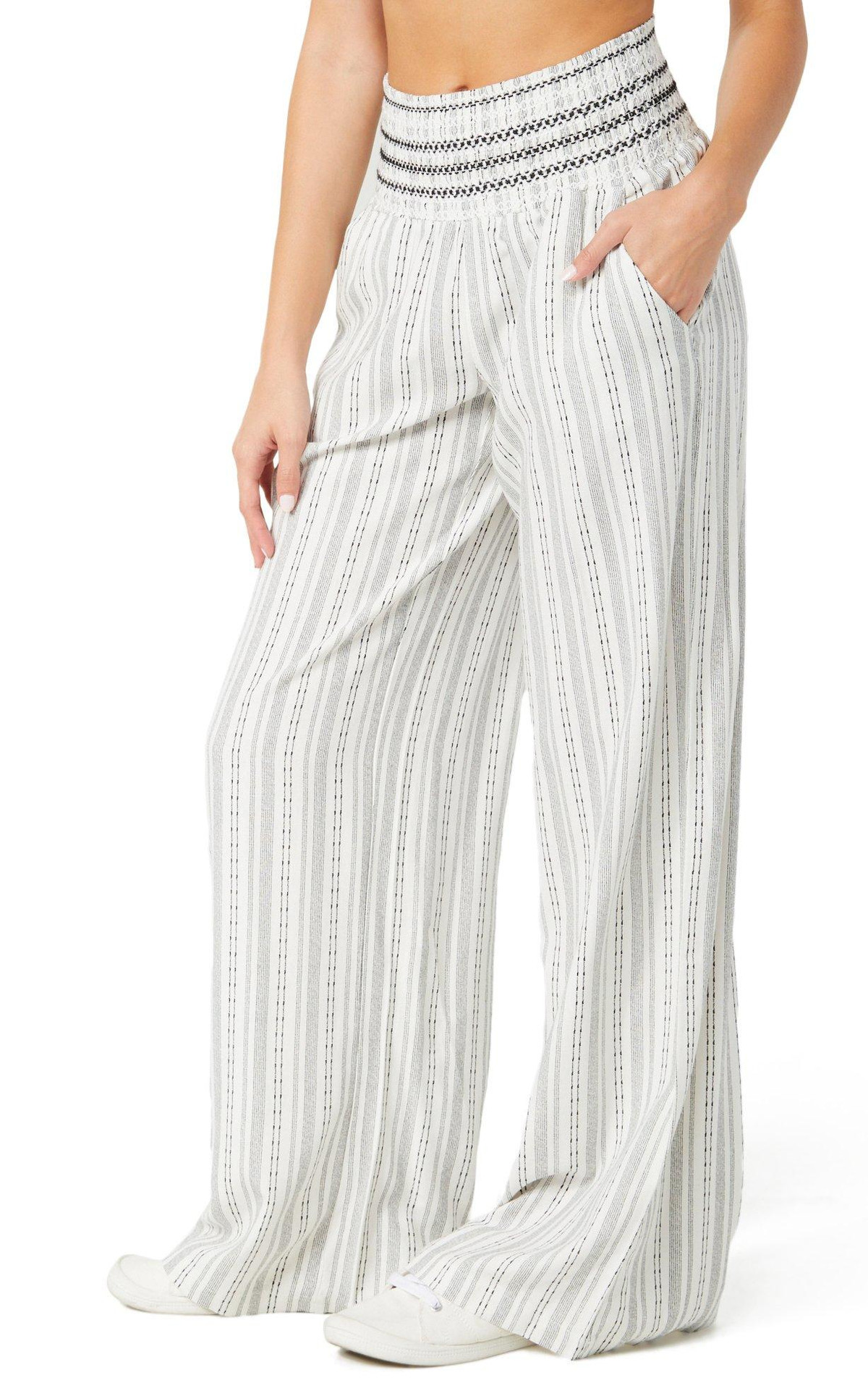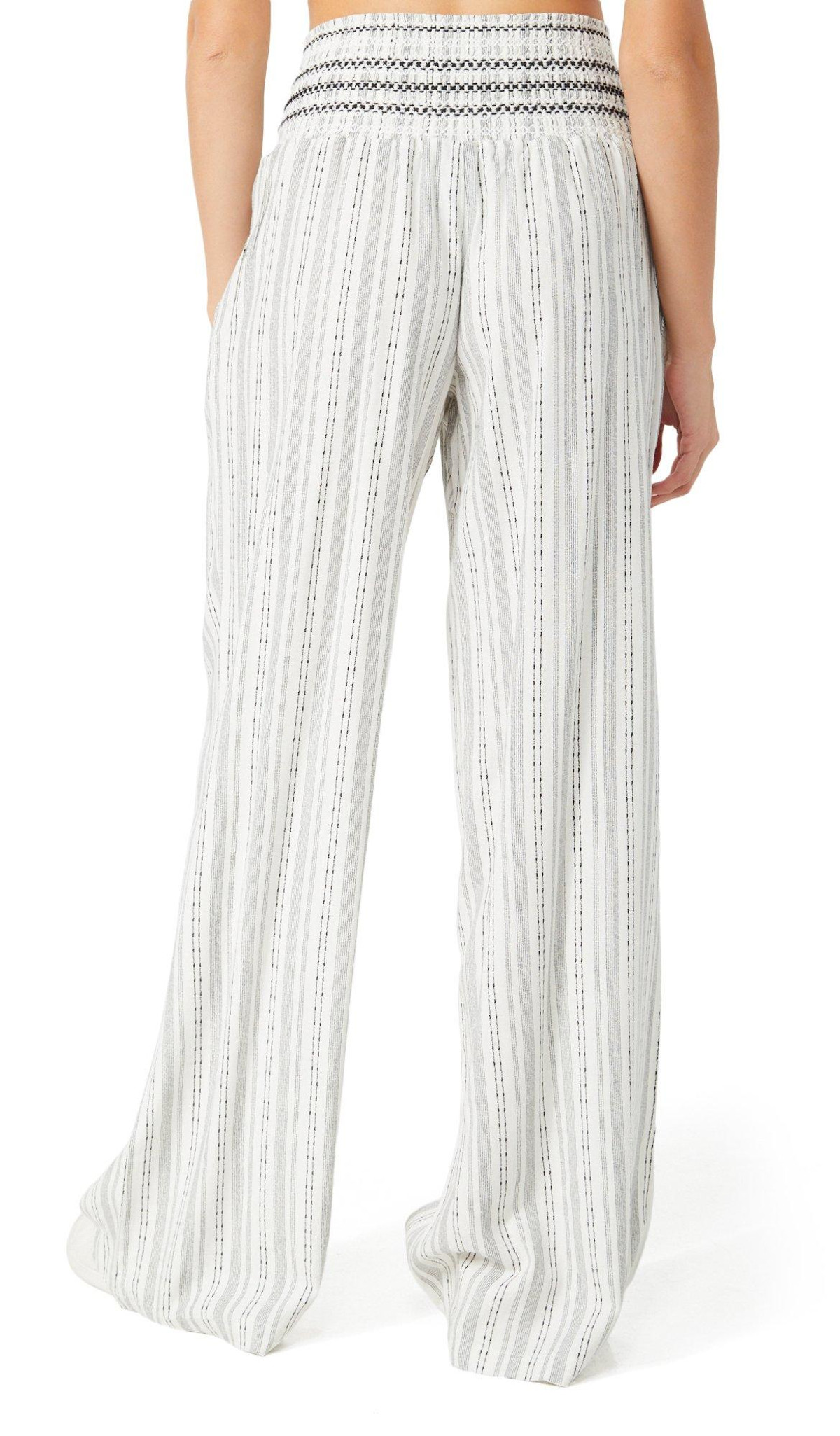 These smocked, wide leg pants feature a striped color and are crafted from a soft linen blend for breathable comfort. With a relaxed shape and easy style, they’re perfect for everyday wear in warm weather. Fabrication is 85% rayon, 12% linen, 3% cotton.