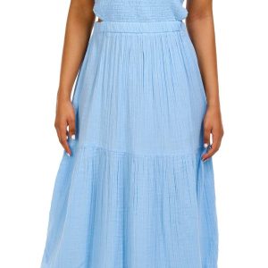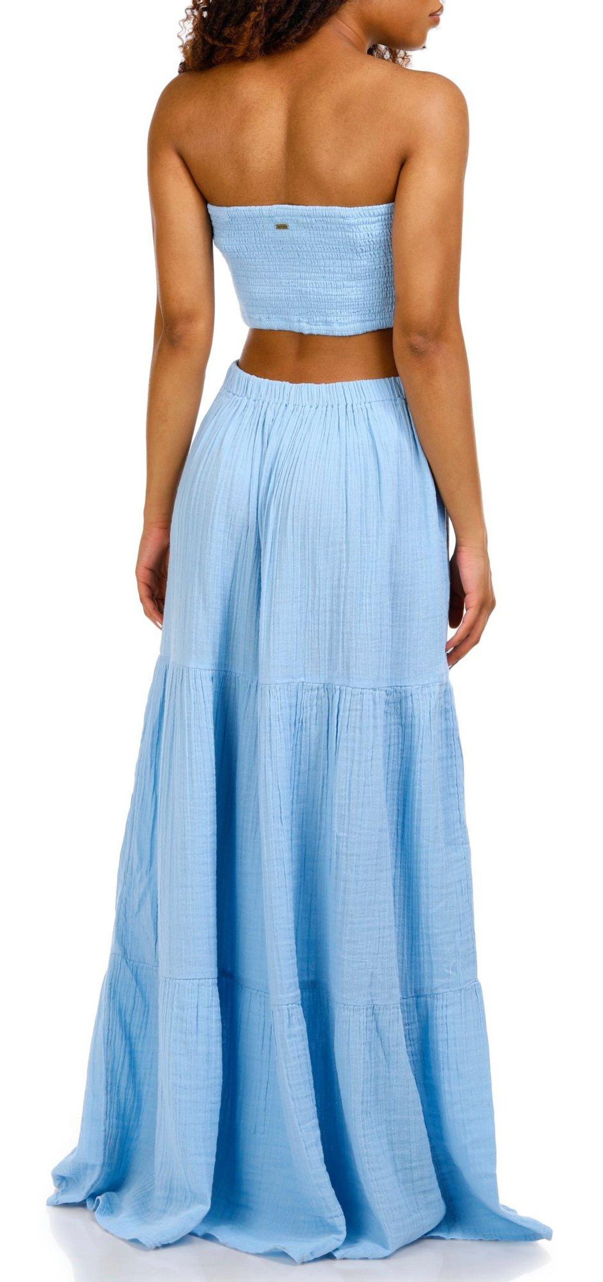 The Premium Surf Maxi Dress offers airy cotton gauze, removable straps, and elegant shirring details. A halter-style staple for sun-drenched evenings or seaside escapes. Fabrication is 100% cotton.