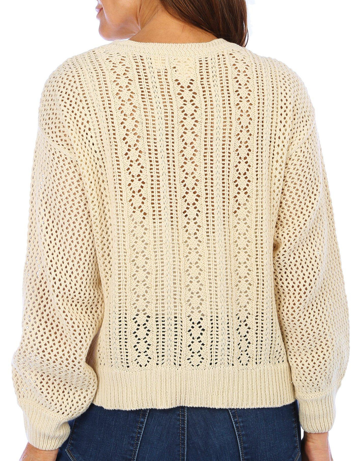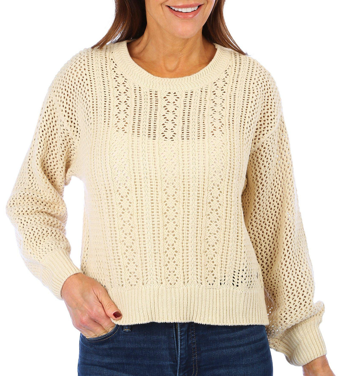 Breezy cotton-blend knit flaunts an airy, pointelle-stitch design-perfect for effortless, beachy-chic style all season. This sweater features a stylish solid color, crew neckline and relaxed fit. Fabrication is 60% cotton and 40% acrylic.