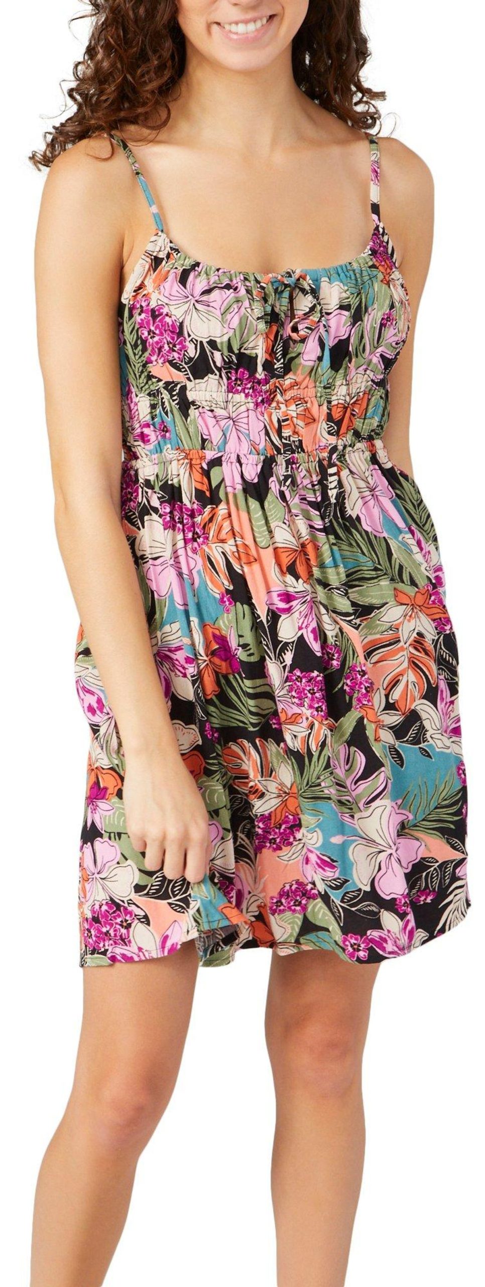 Introducing the Juniors La Vida Mini Dress, crafted from 100% viscose for a lightweight and flowy feel. This dress features a vibrant tropical floral print that brings a touch of paradise to your wardrobe. The adjustable straps ensure a perfect fit, while the keyhole neckline adds a stylish detail. With a length of 24 inches, this mini dress is perfect for warm weather outings, offering a chic and breezy look for any occasion.