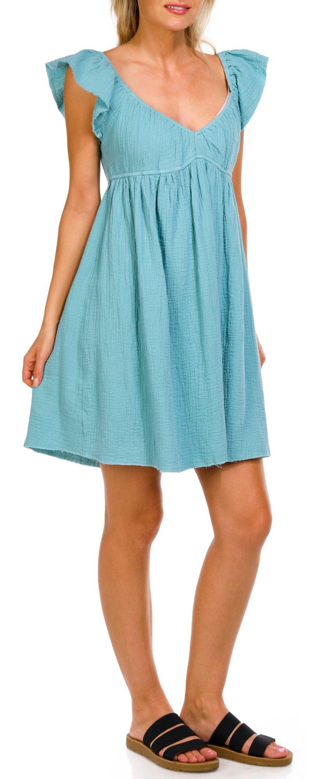 Finished in breathable cotton comfort, this flutter sleeve mini is the perfect easy, breezy summertime dress. It fetaures a stylish solid color, short flutter sleeves, a v-neckline, and 36 inch length.