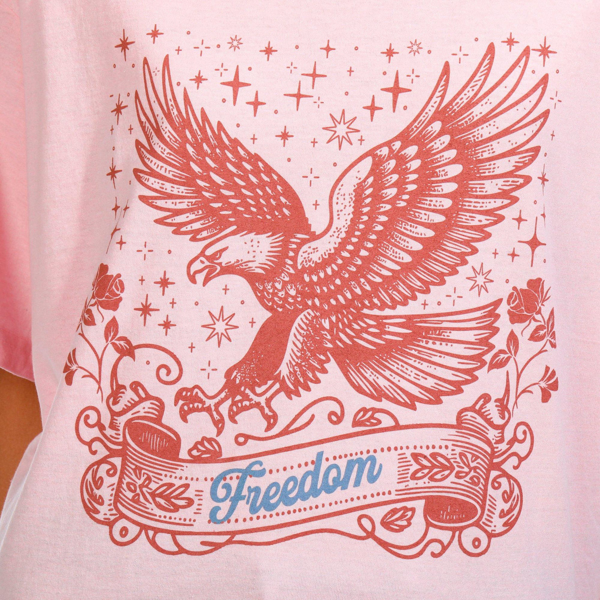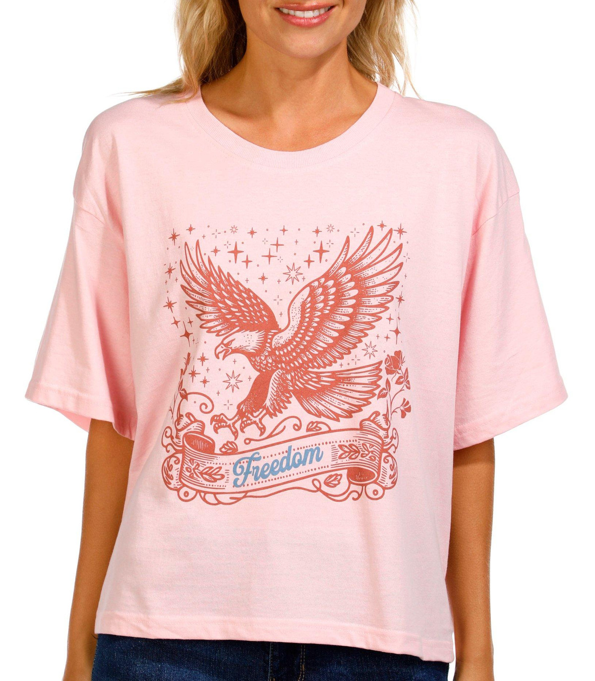 Show your patriotic spirit with this Juniors Freedom Eagle Graphic Crop T-Shirt. Featuring a bold design of an eagle landing above the word Freedom. Crafted from a soft, breathable cotton-poly blend, it offers a comfortable fit with short sleeves, a classic crew neckline, and a trendy cropped cut. Fabrication is 60% cotton, 40% polyester. Top length measures approximately 22 in.