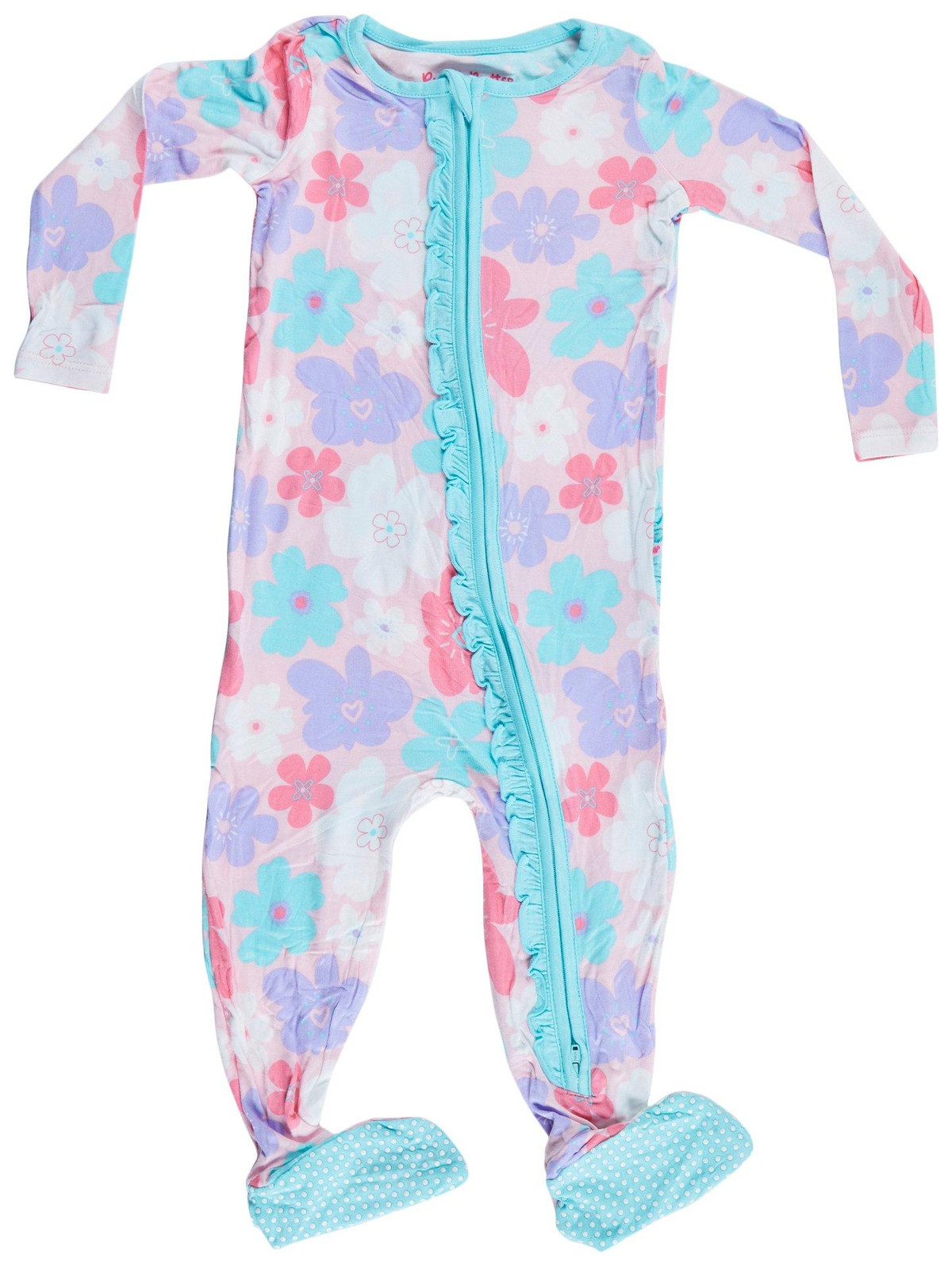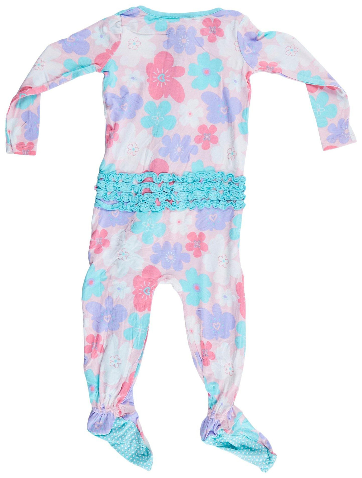 Introducing the Baby Girls Groovy Garden Footed Sleeper, made from a soft blend of viscose and spandex for ultimate comfort. This stylish sleeper features a vibrant floral print, a zip-up front closure for easy dressing, footed legs to keep little feet warm, and long sleeves for added coziness. Perfect for bedtime or lounging, this sleeper combines fashion and functionality, ensuring your baby girl stays comfortable and adorable.