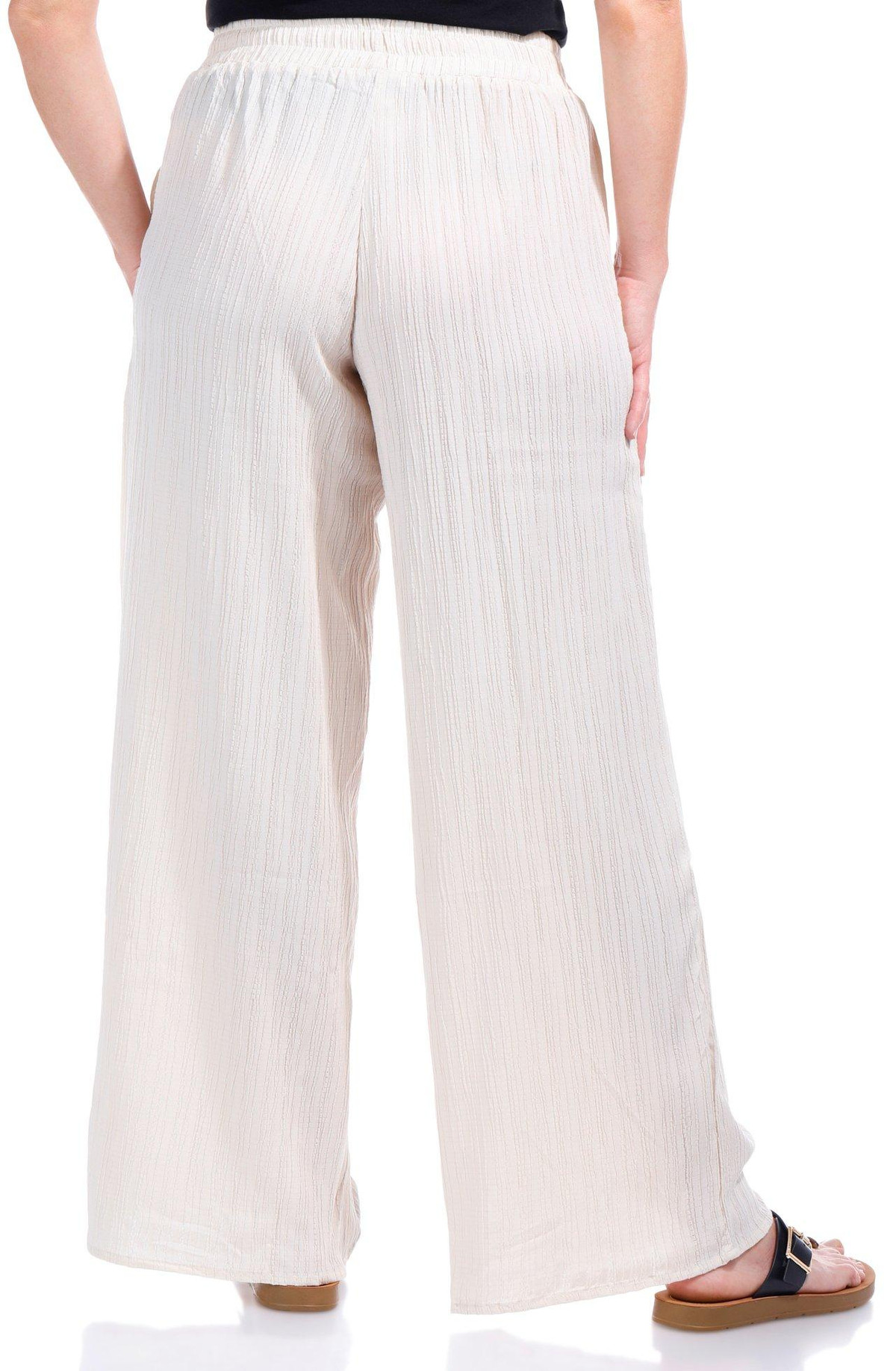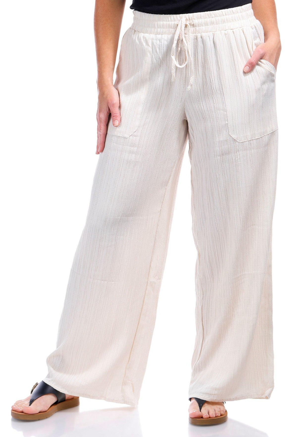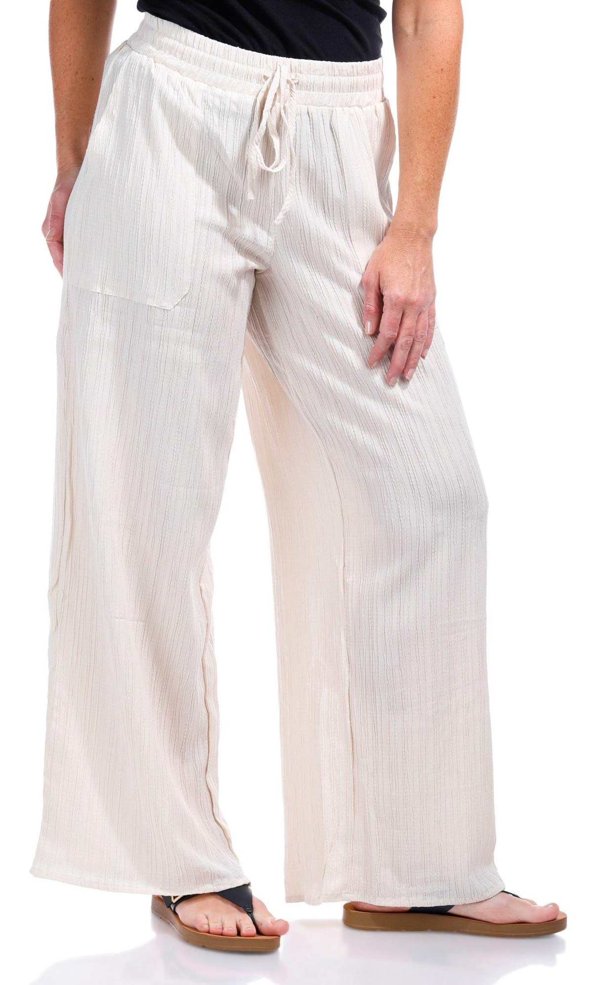 Relax in effortless style with these Casual Pants, featuring a breezy crinkle-textured fabric and a comfortable drawstring waist for the perfect fit. Double side slip pockets add function to the laid-back design, making them ideal for lounging or stepping out in easygoing comfort. Fabrication is 57% polyester, 40% rayon, 3% spandex.