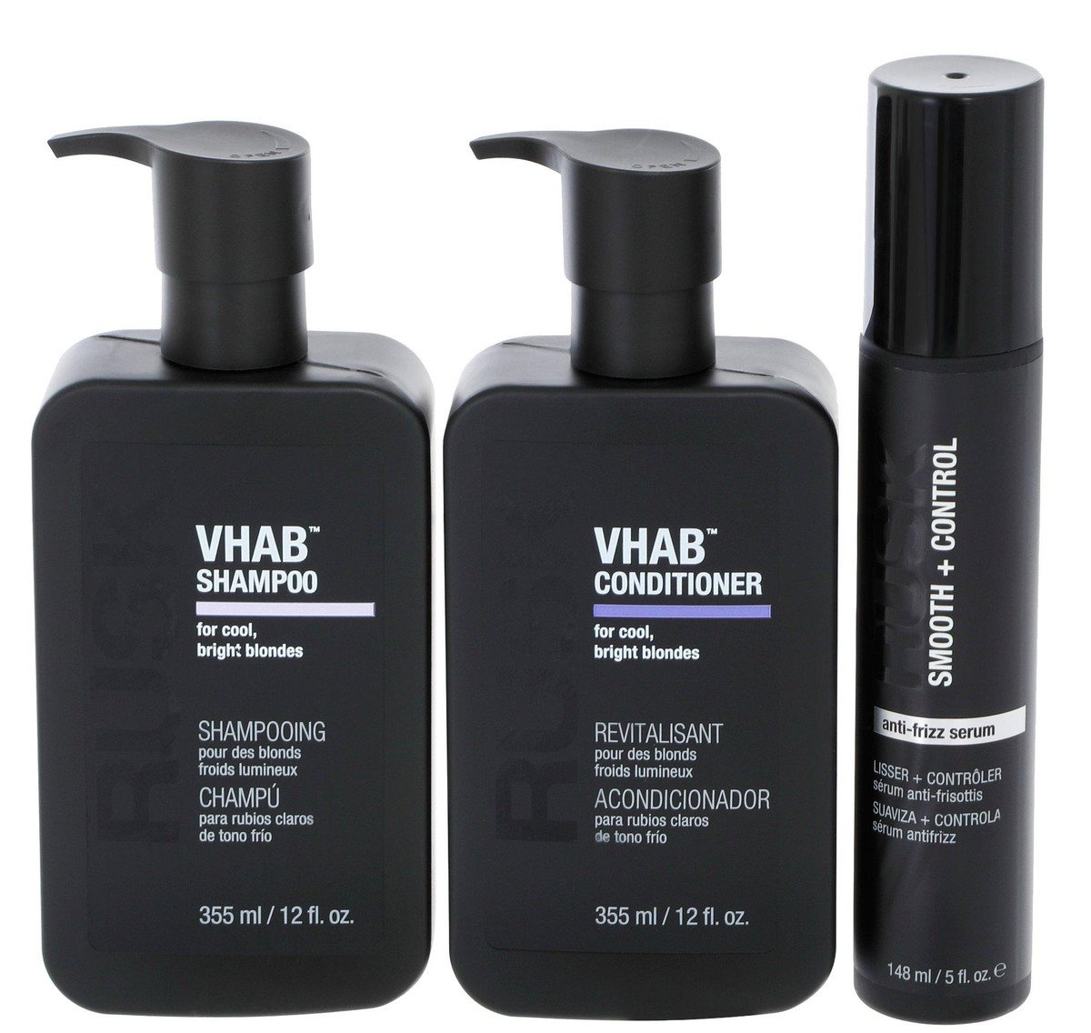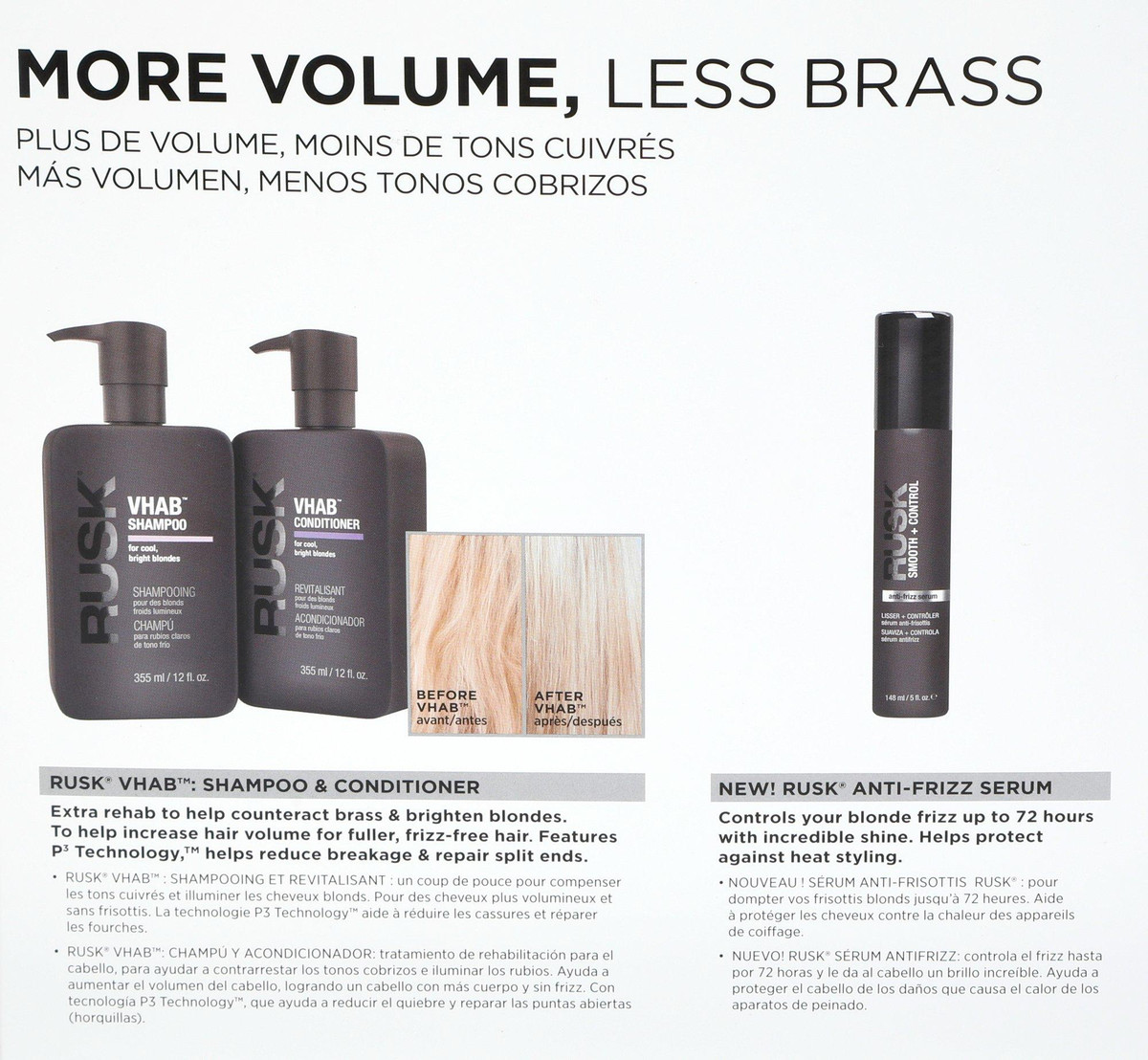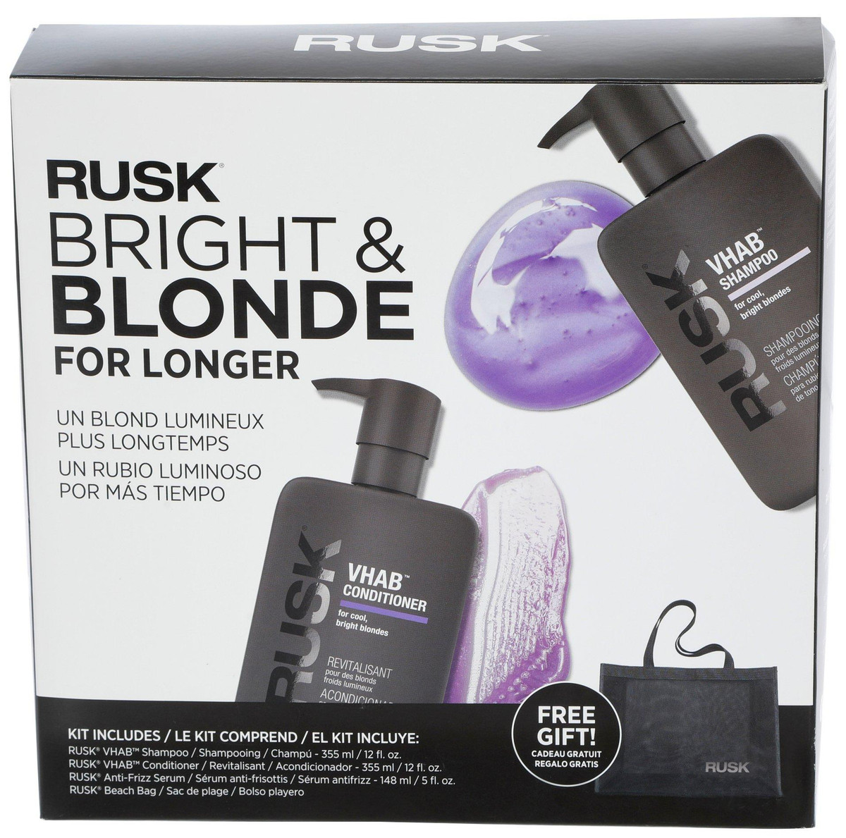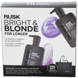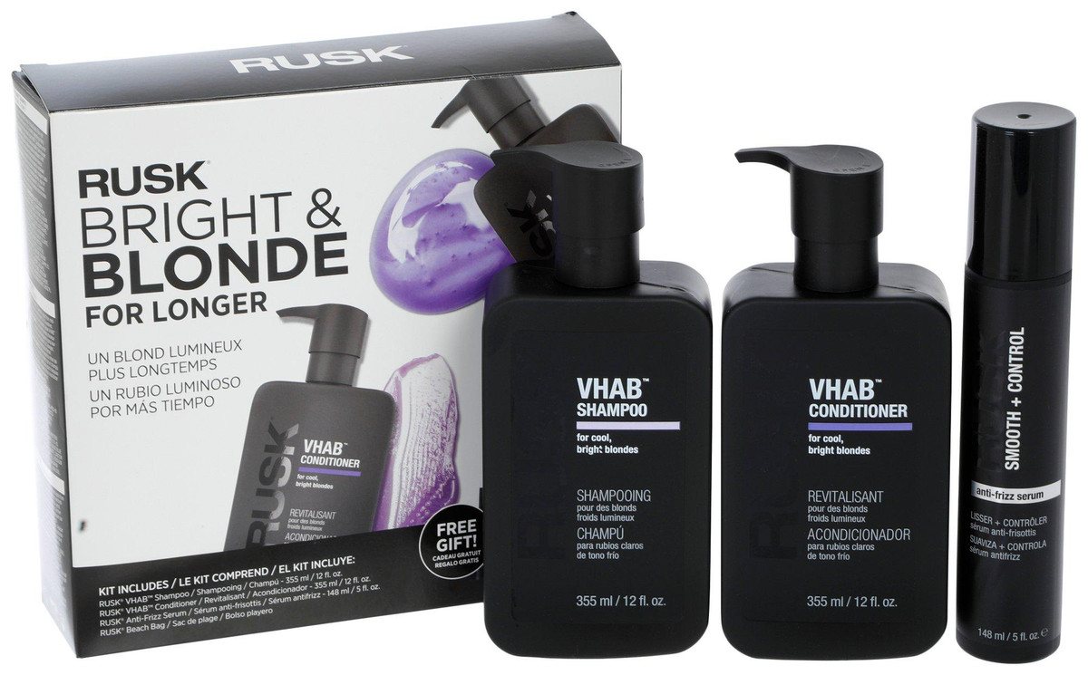 Extra rehab for lightened hair. Formulated with P3 Technology and a unique blend of violet pigments to keep your blonde while reducing breakage, fighting frizz and repairing split ends up to 44%. KIT INCLUDES: RUSK VHAB Shampoo 12 oz, RUSK VHAB Conditioner 12 oz, RUSK Anti-Frizz Serum 5 oz, Complimentary RUSK Beach Bag.
