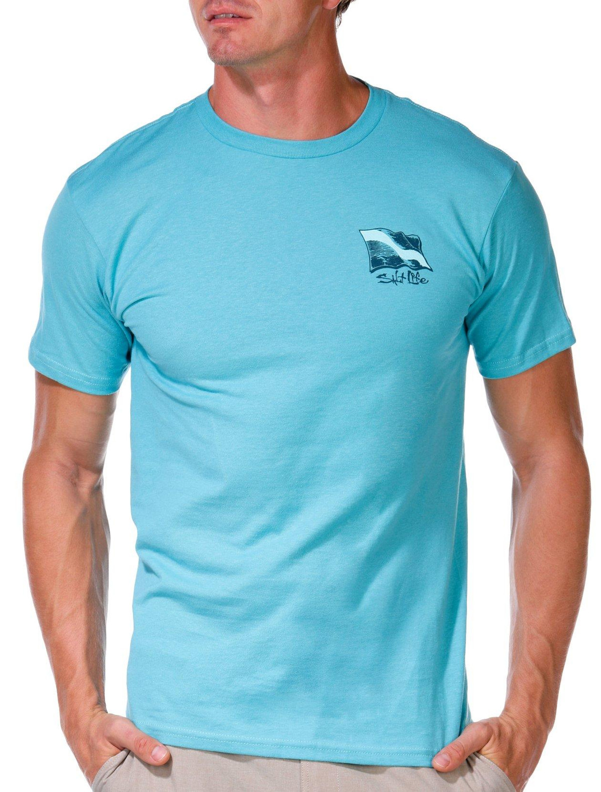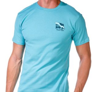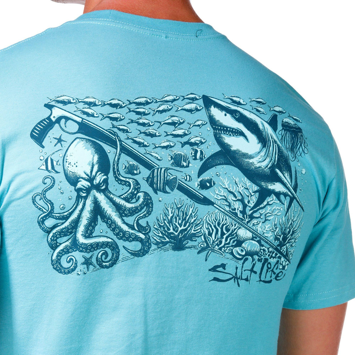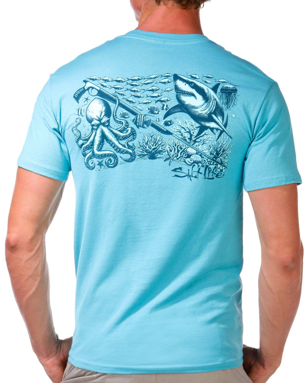 This mens underwater diving t-shirt features a classic crew neckline and short sleeves for everyday comfort. A brand logo accents the chest while a bold underwater diving inspired graphic on the back adds a dynamic touch perfect for ocean enthusiasts. Fabrication 100% cotton