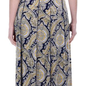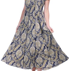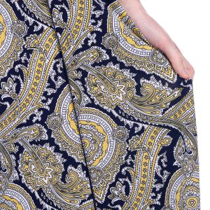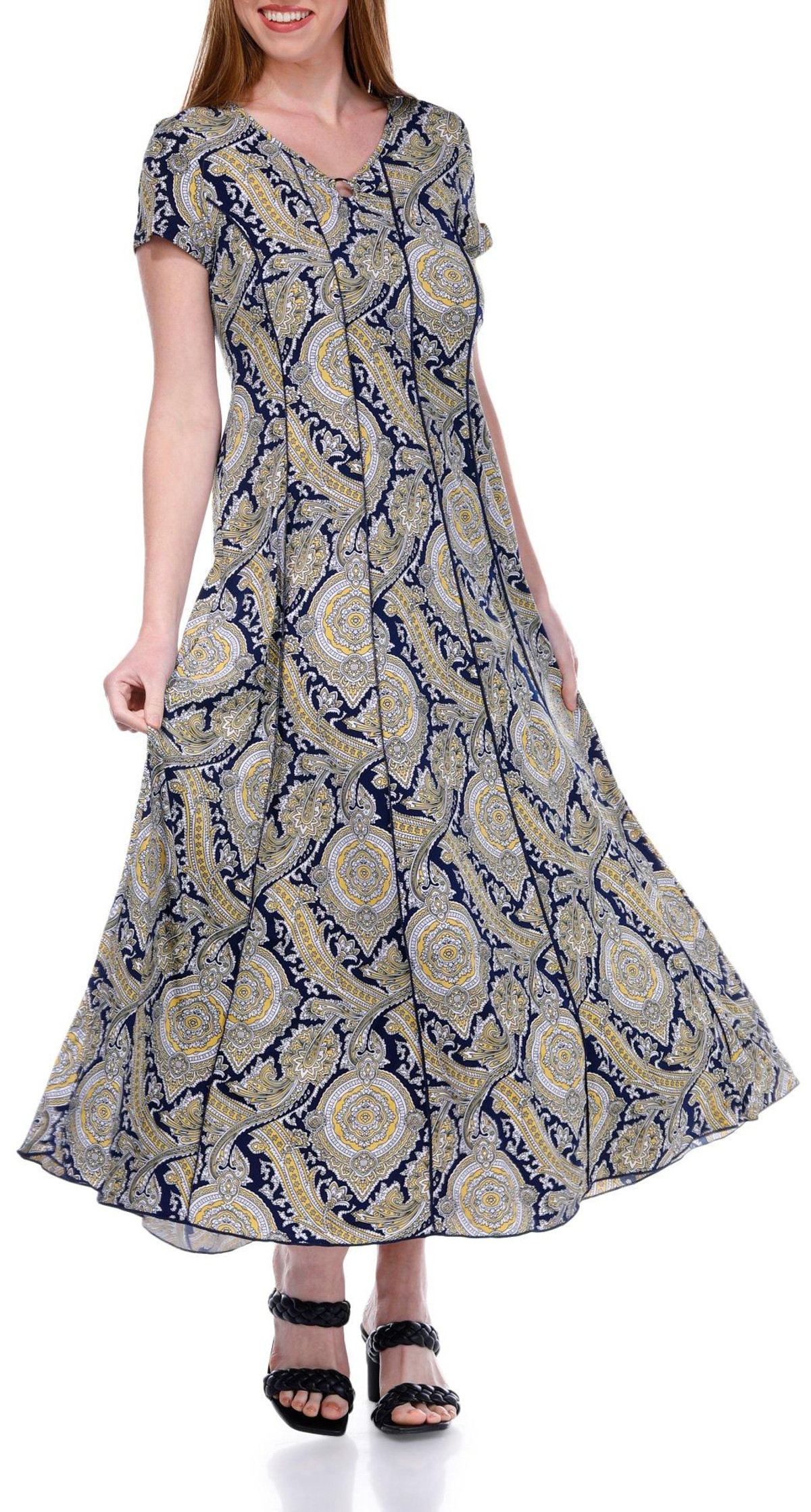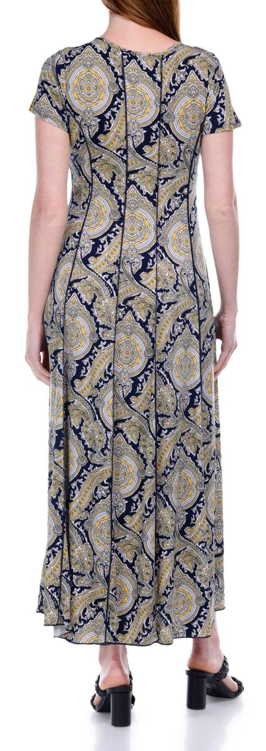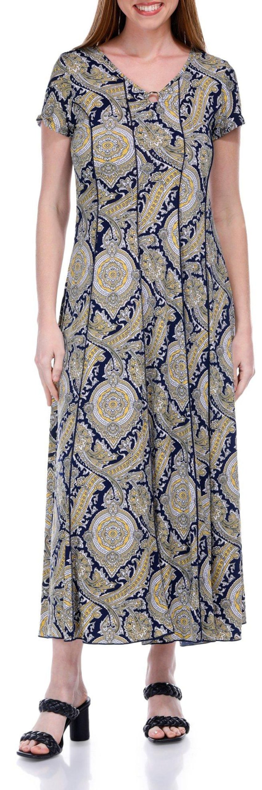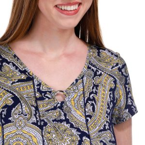 Introducing the Women’s Short Sleeve Paisley Maxi Dress, crafted from a blend of polyester and spandex. This dress features a stylish paisley print that adds a touch of elegance to your wardrobe. The panel detail on the front offers a unique and flattering look, while the short sleeves provide comfort. The v-neckline with ring accent adds a trendy touch, and the 50-inch length ensures a perfect fit.