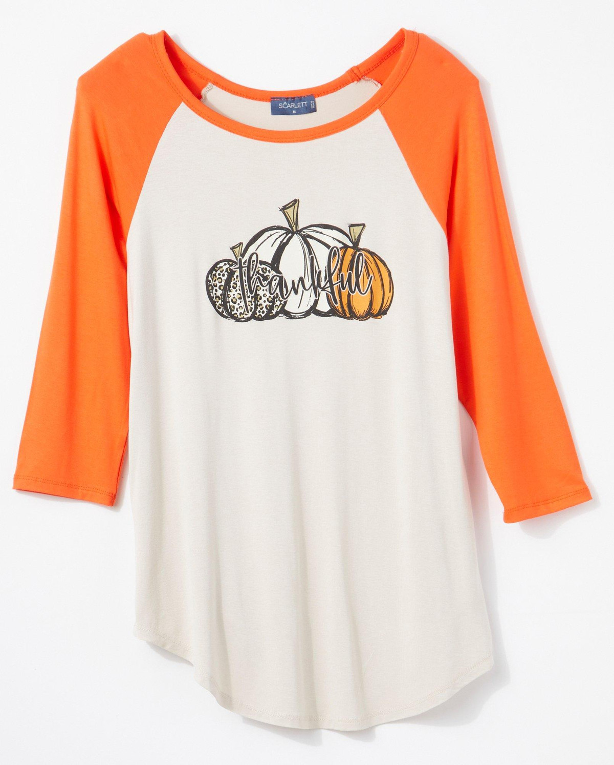 Scarlett Womens 3/4 Sleeve Soutache Pumpkin Thankful Top