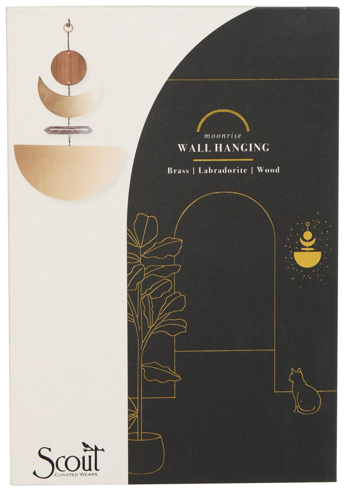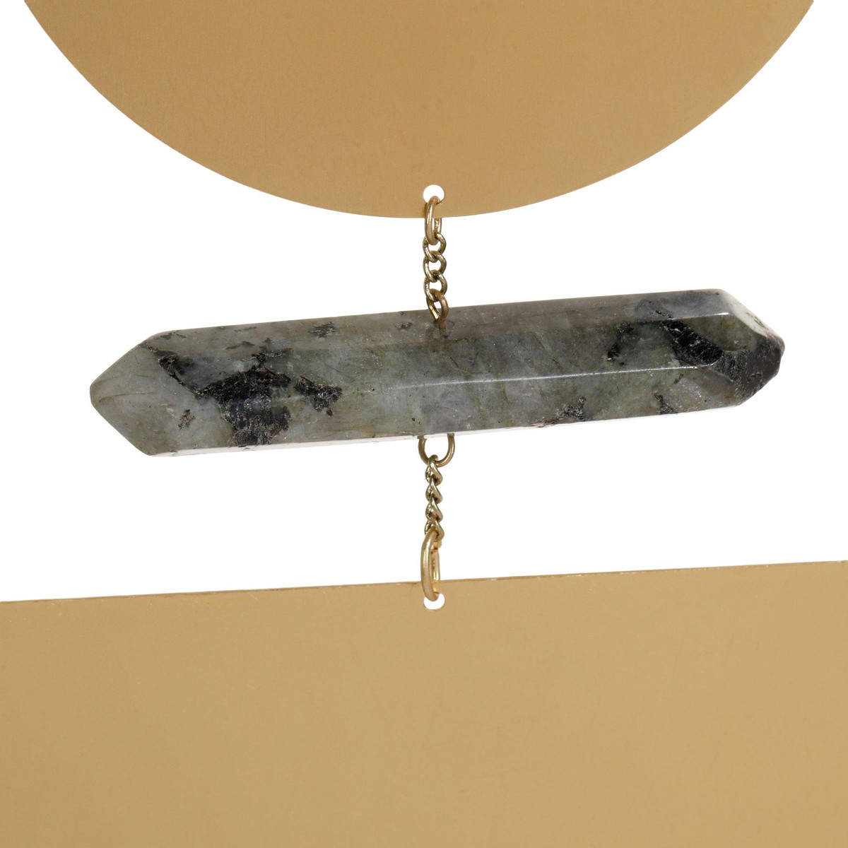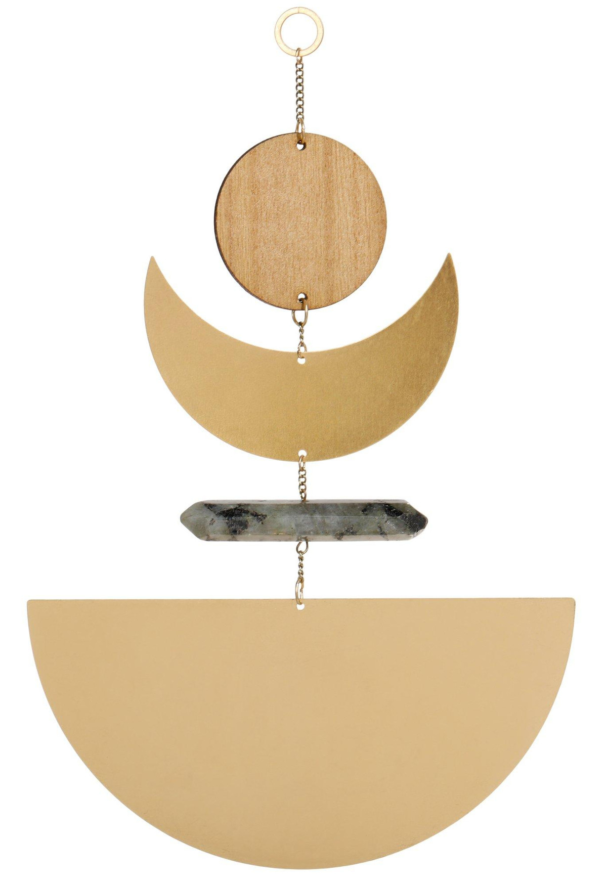 Elevate your home with the enchanting Moonrise Wall Hanging Decor. This stunning piece combines brass, labradorite, and wood to create a harmonious and captivating design. The brass elements add a touch of elegance, while the labradorite stones bring a mystical shimmer, and the wooden accents provide a natural warmth. Measures approximately 9.25 in x 6 in.