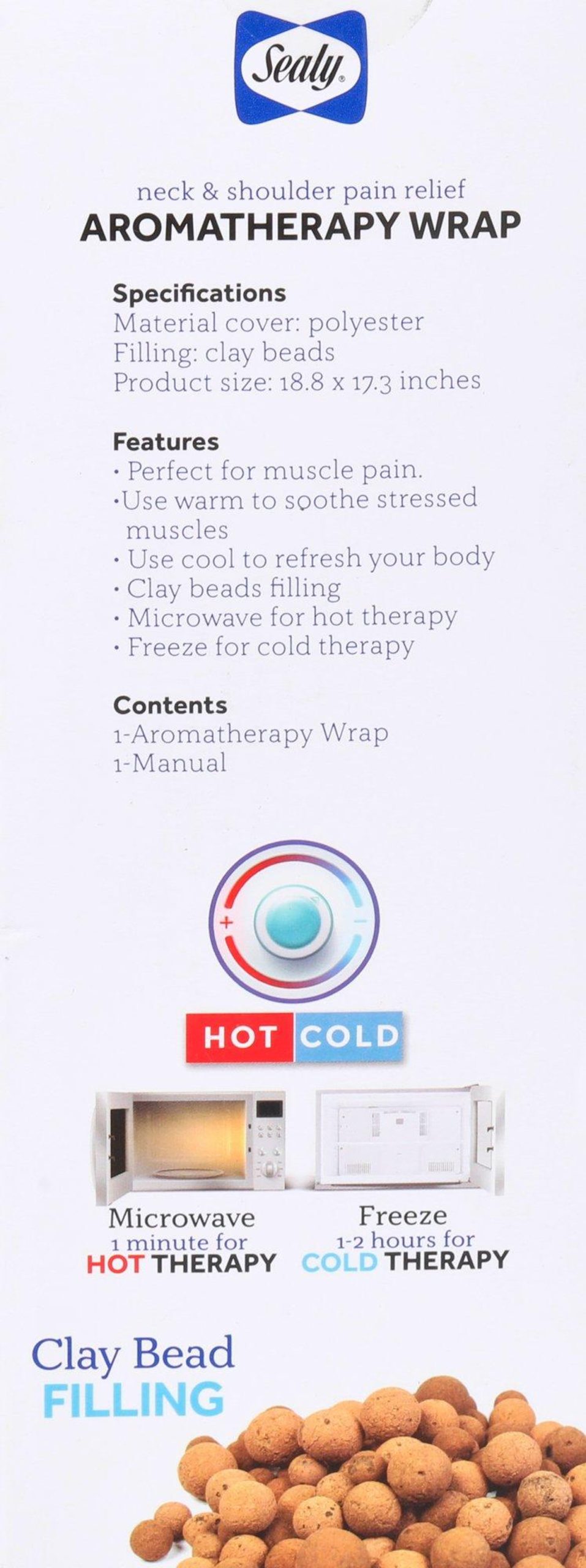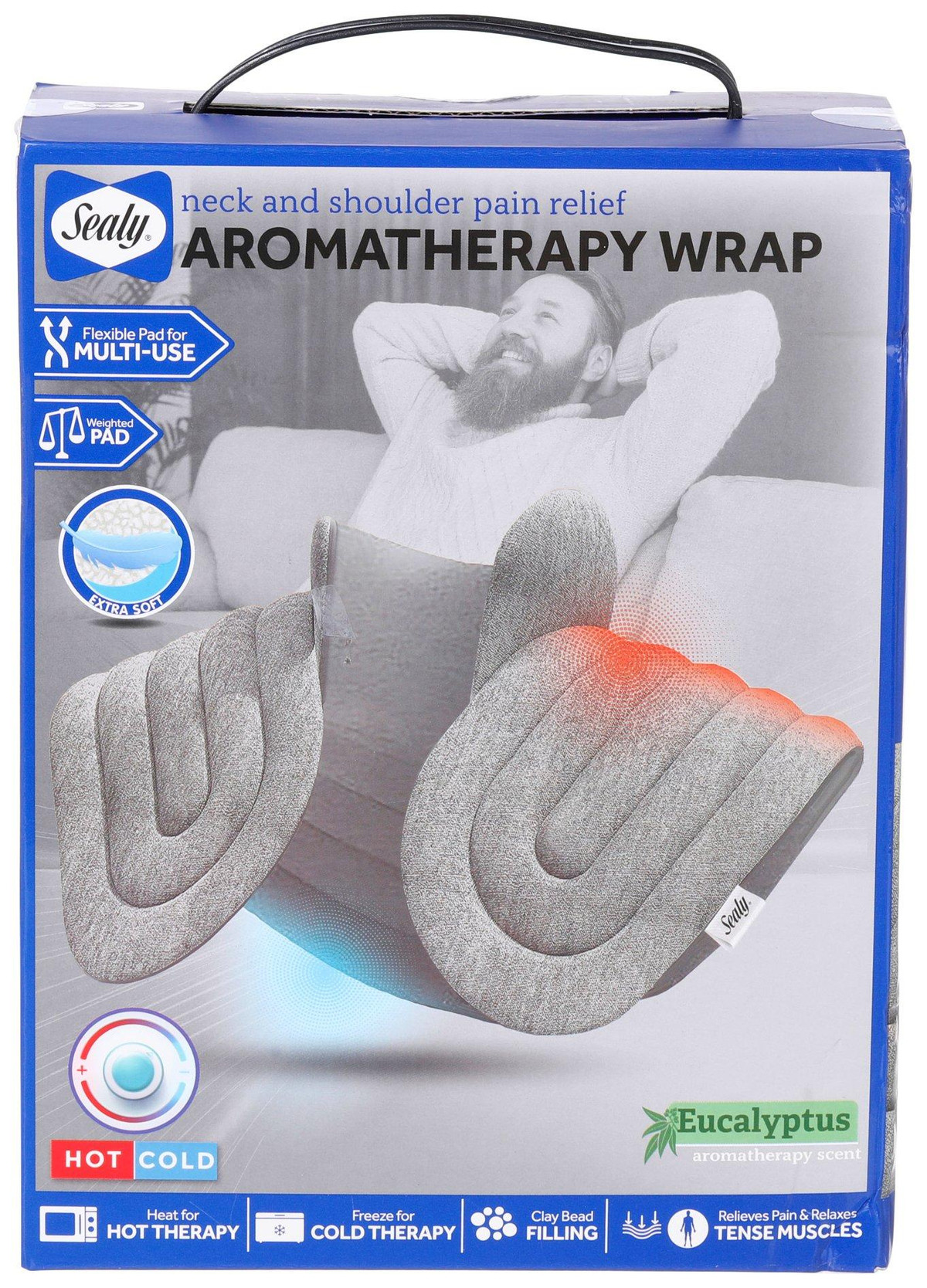 Ease neck and shoulder pain with the Sealy Aromatherapy Wrap. Infused with soothing eucalyptus scent, this flexible and weighted pad features clay bead filling. Can be used for both hot and cold therapy to relieve pain and relax tense muscles.