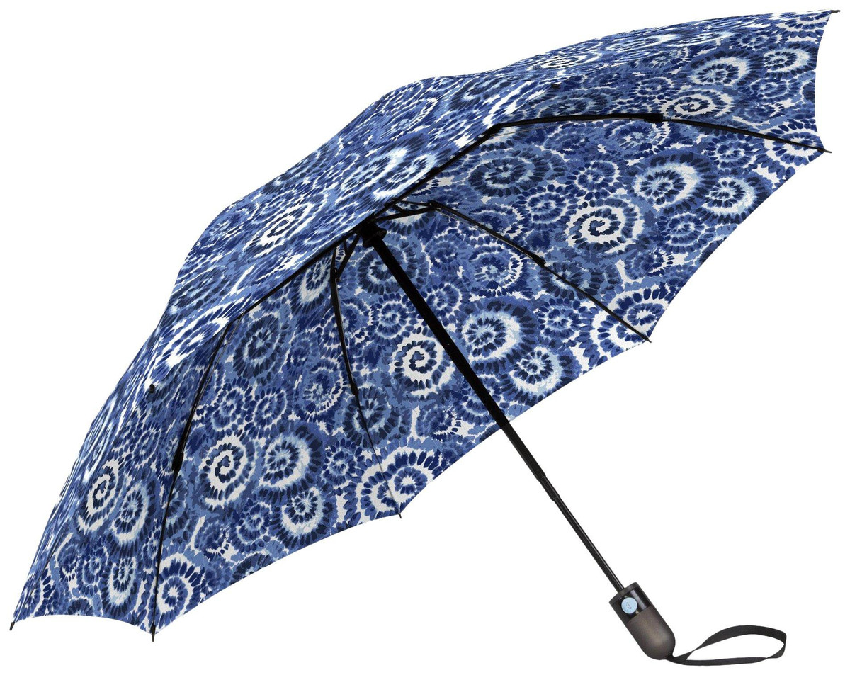 Opening and closing automatically at the push of a button, the 47-inch canopy arc collapses in reverse to keep the rain off you, away from your stuff and out of your car. Featuring a black electrostatic steel shaft and ribs paired with FRP fiberglass for strength, the rubber-coated handle has a matching button to the canopy color.